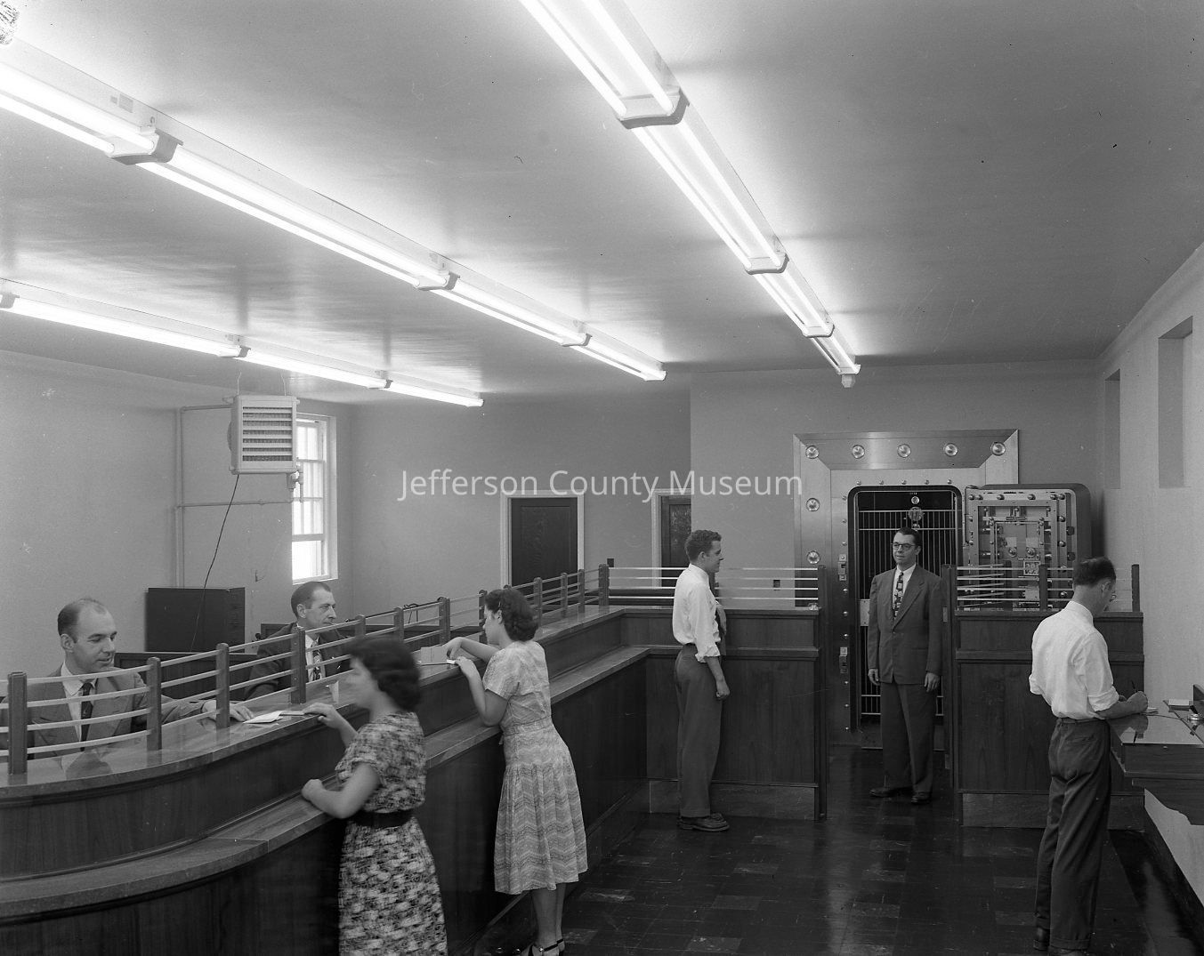 Blakeley Bank and Trust employees at original location of Third Avenue in Ranson, opening day, R. J. Funkhouser in background of inside crowd photo