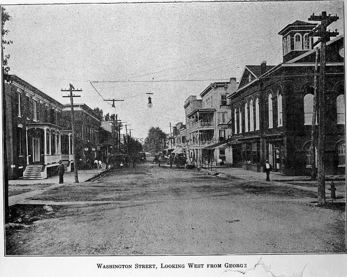 Washington Street looking west from Public Square. The Jefferson County Jail (left), the Sadler Block (left center), the Watson House (right center), and Charles Washington Hall (right) are visible in the photograph. C. 1890s