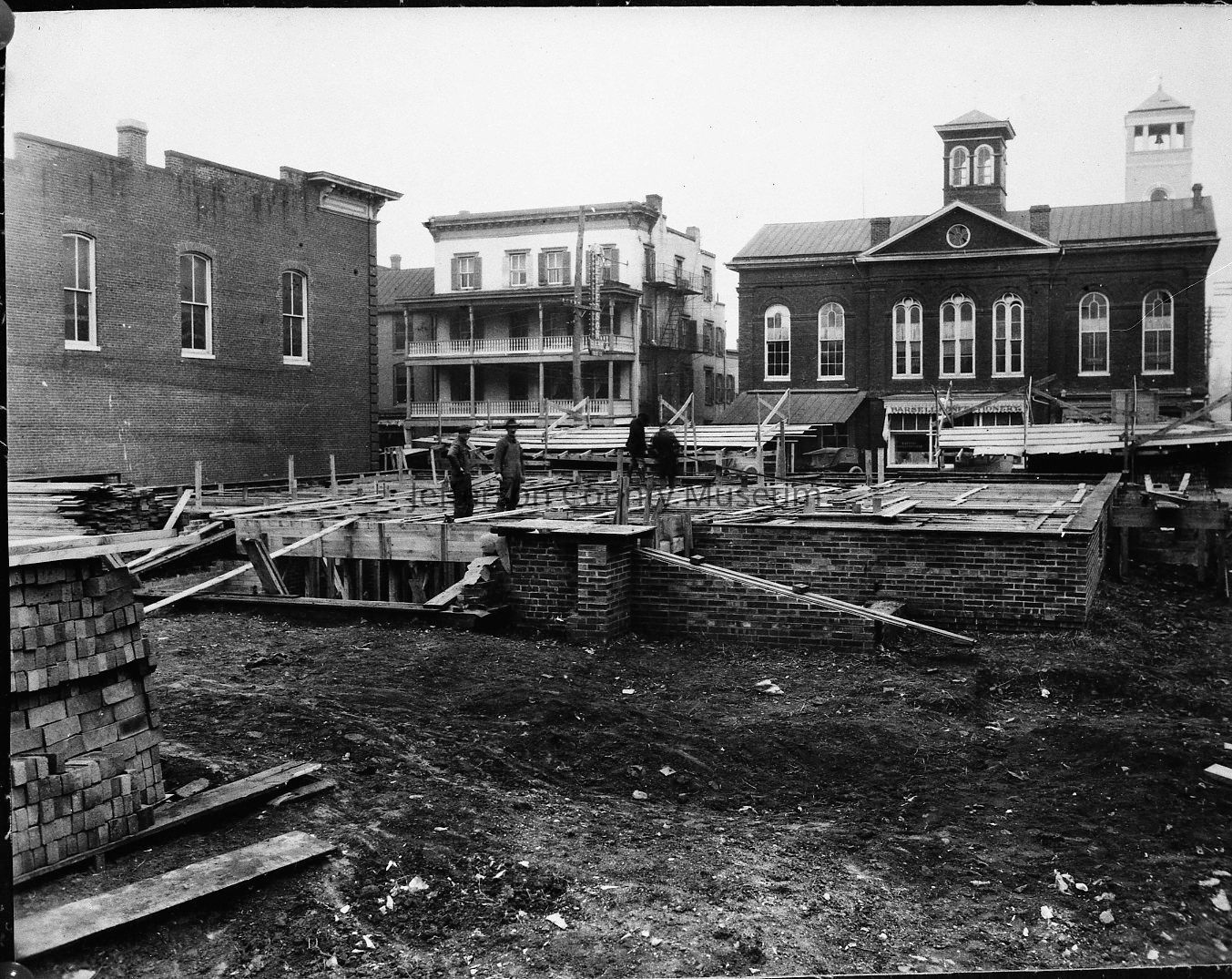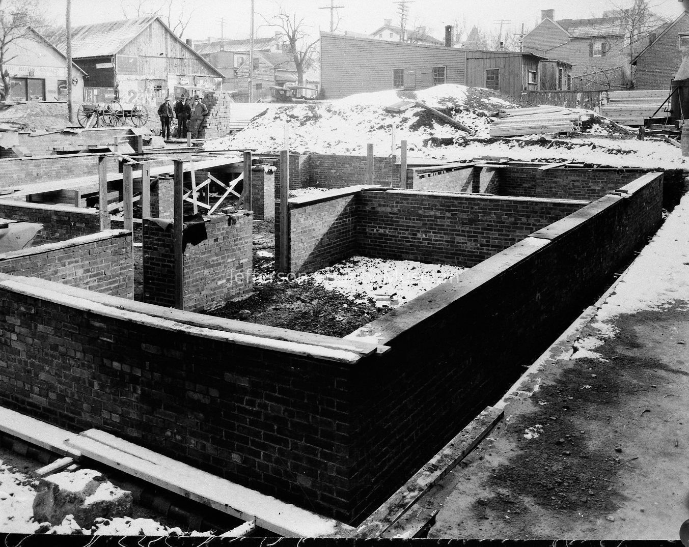 Four photographs of razing the Jefferson County Jail when located on the southwest corner of George and Washington Street. 1- view of the front (north) elevation taken from Paradise Alley; 2- view of post office foundation looking north with the Palm Hotel (left) and Charles Washington Hall (right) in background; 3- view of post office foundation from northeast corner looking southwest - Charles Town General Hospital visible in center; 4- view of post office building under roof looking from Paradise Alley.