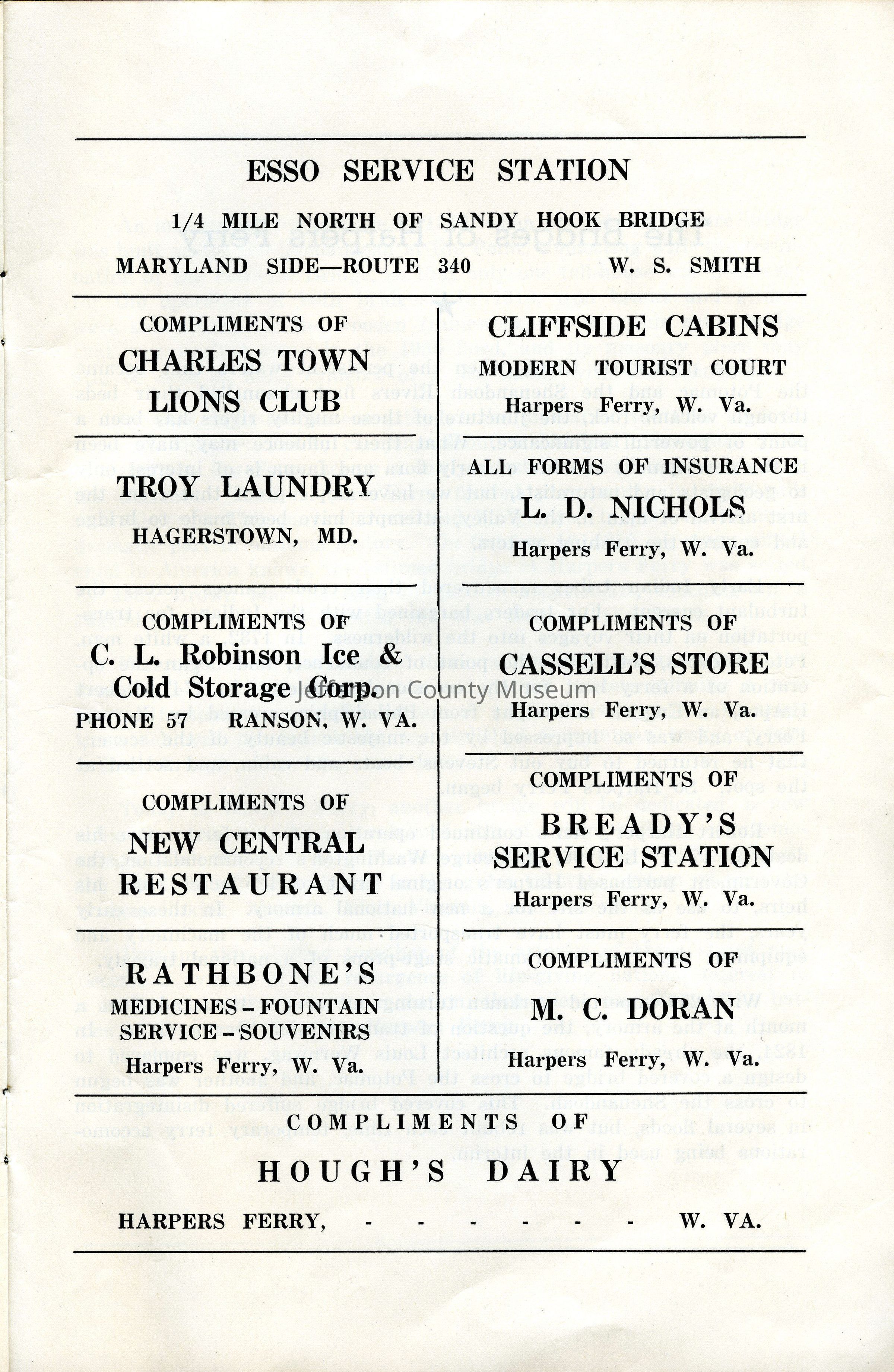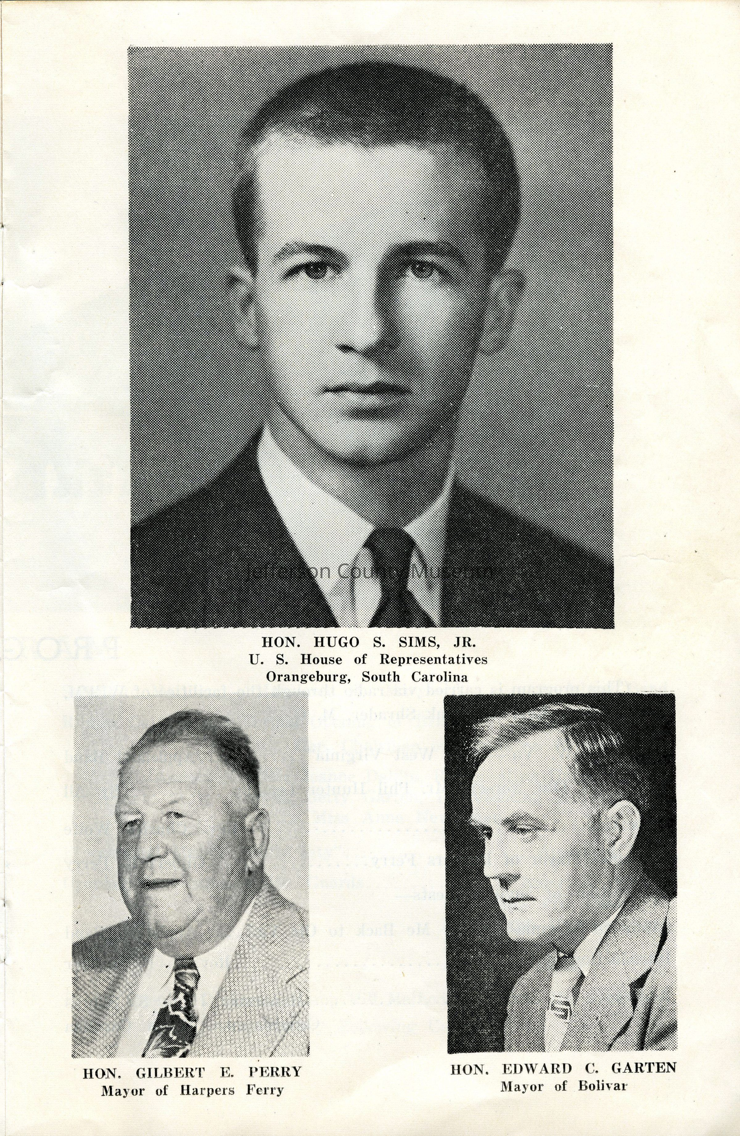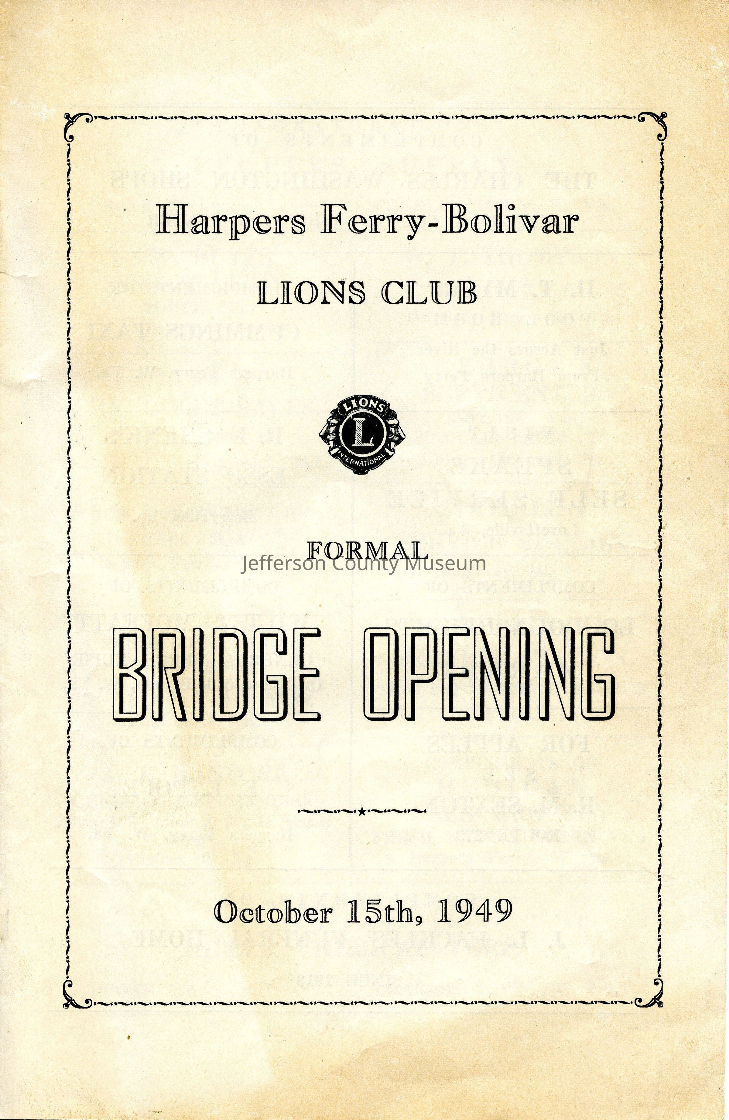 Booklet prepared for the opening of the new bridge over the Shenandoah River at Harpers Ferry on October 15, 1949. Contains a history of bridges at Harpers Ferry, the program for the opening day events, ads/compliments from local businesses and individuals, list of names of invited guests and members of general committee, acknowledgements of individuals and organizations, and photographs of Hugo Simms, Congressman, South Carolina, who gave the address; Gilbert E. Perry, mayor of Harpers Ferry; and Edward C. Garten, mayor of Bolivar; and new bridge from Route 340 in Bolivar.