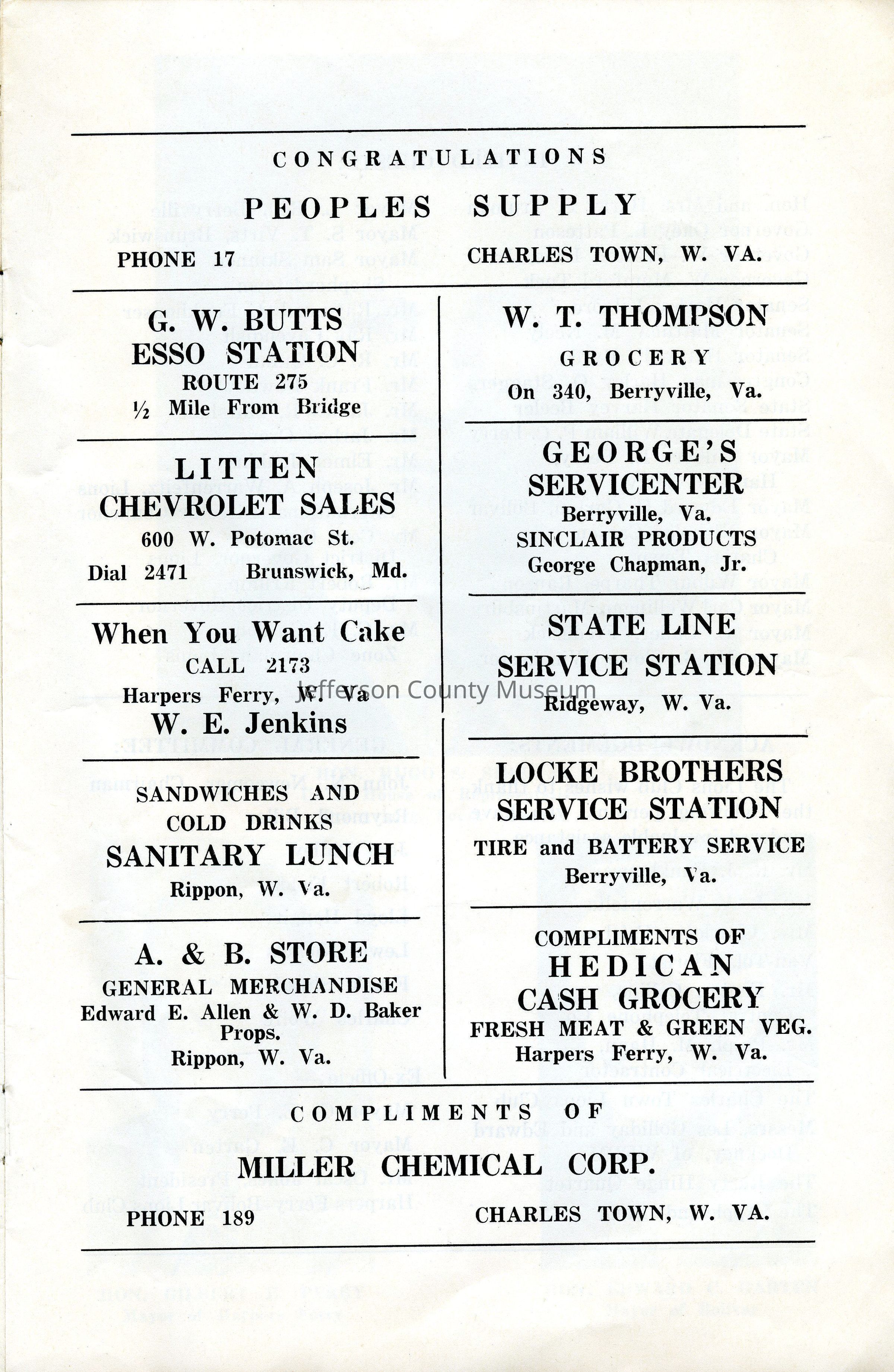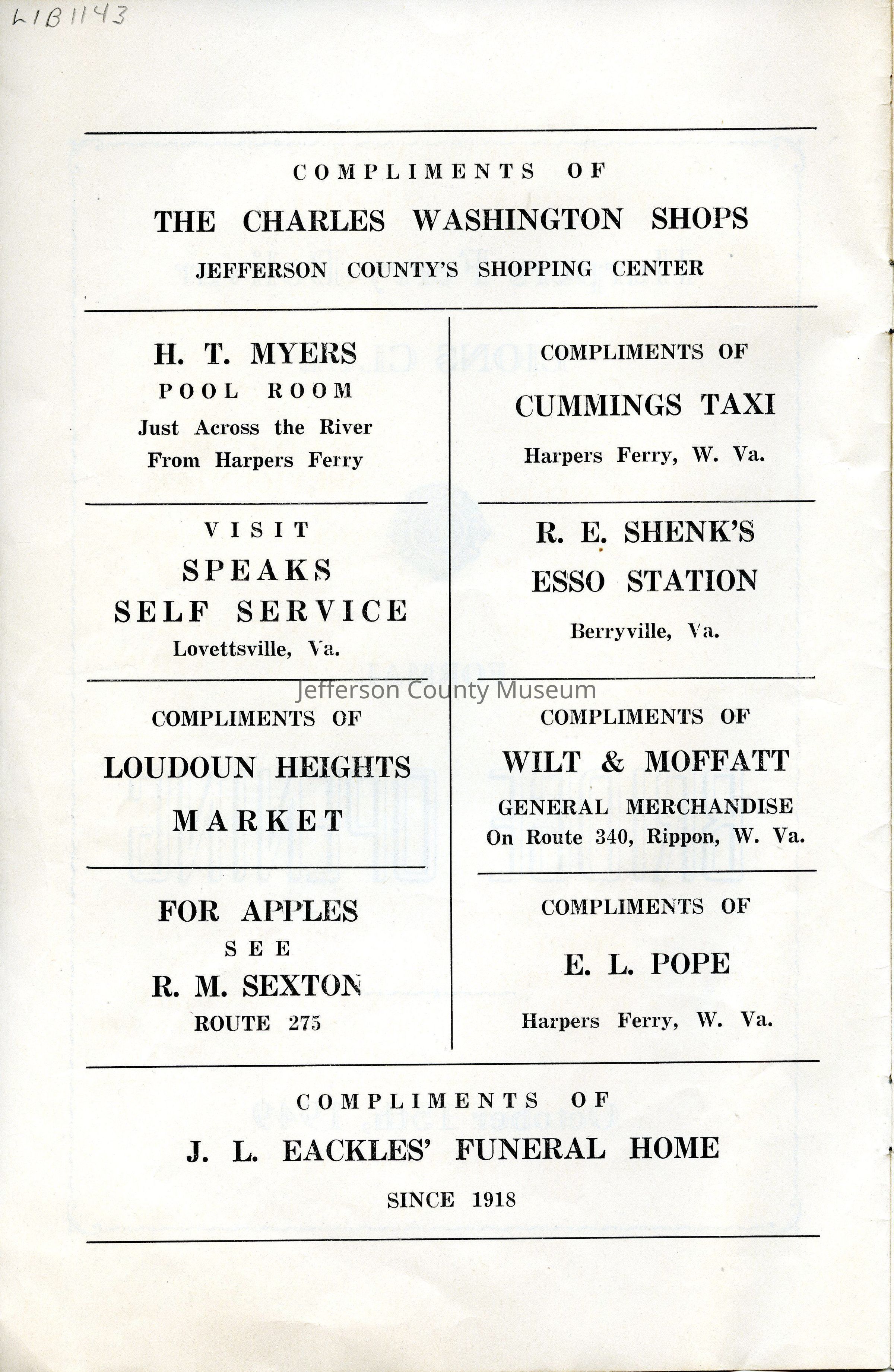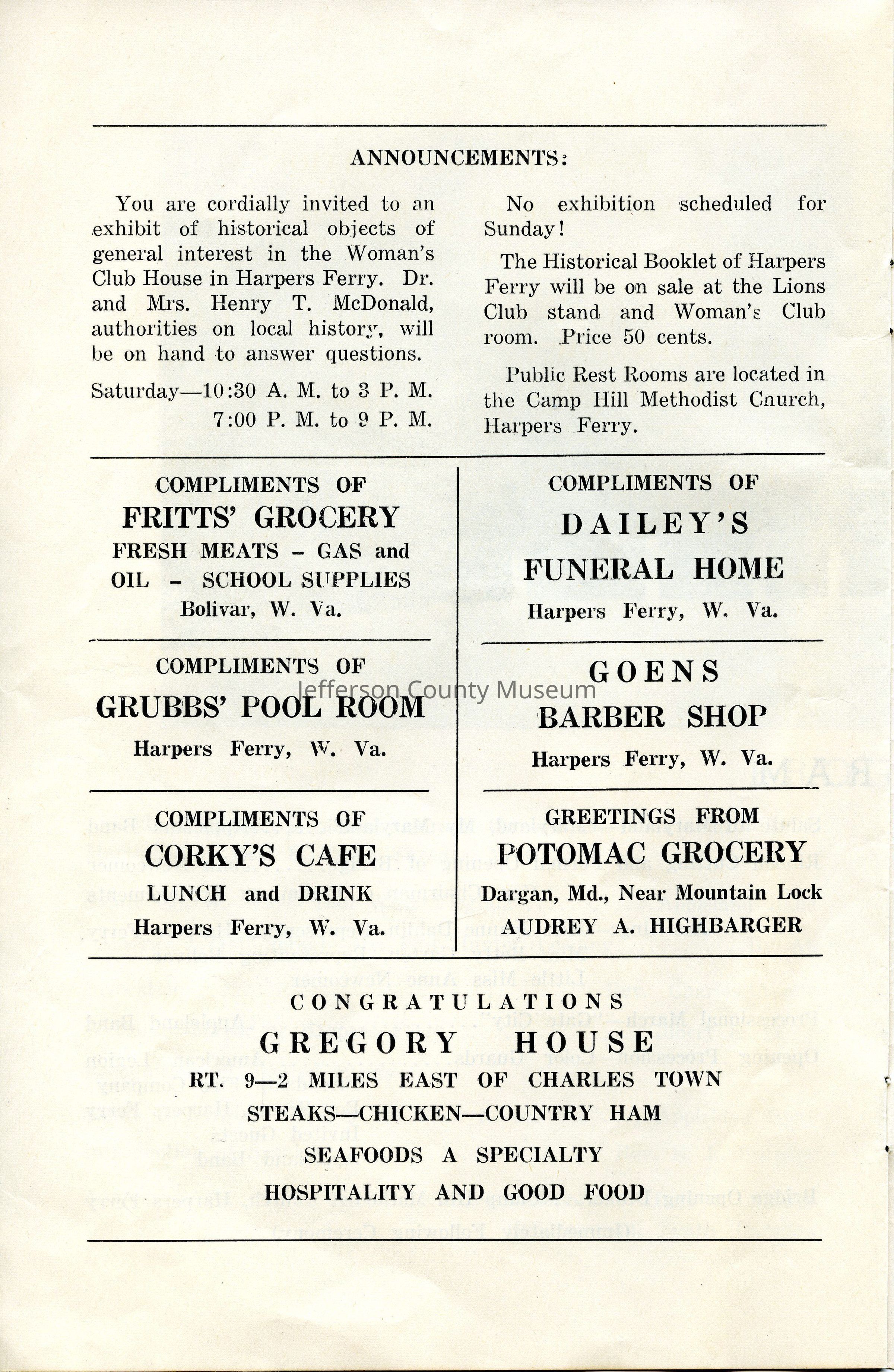 Booklet prepared for the opening of the new bridge over the Shenandoah River at Harpers Ferry on October 15, 1949. Contains a history of bridges at Harpers Ferry, the program for the opening day events, ads/compliments from local businesses and individuals, list of names of invited guests and members of general committee, acknowledgements of individuals and organizations, and photographs of Hugo Simms, Congressman, South Carolina, who gave the address; Gilbert E. Perry, mayor of Harpers Ferry; and Edward C. Garten, mayor of Bolivar; and new bridge from Route 340 in Bolivar.