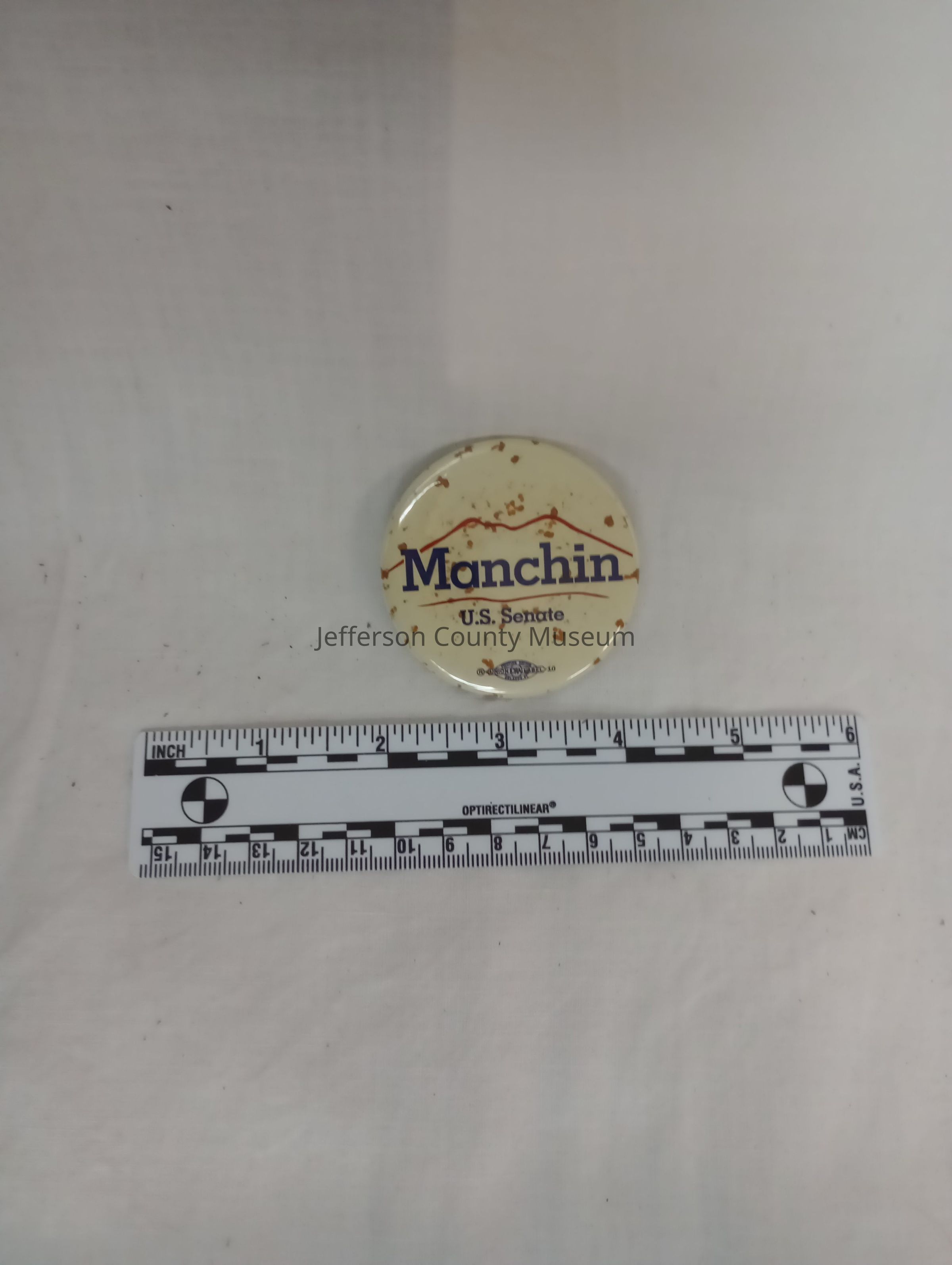 White button with a red outline of a mountain and the blue text "Manchin U.S. Senate" with a union label at the bottom.Context