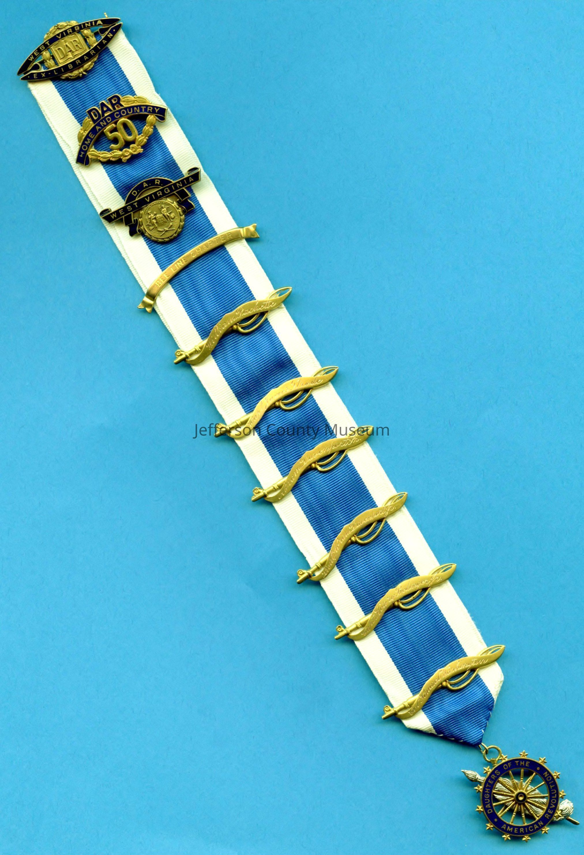 DAR ancestor ribbon of Frances Davenport Packette Todd. Gold-colored metal ancestor and chapter bars (7) on blue and white ribbon. Wheel-shaped emblem of the DAR on the base, 14k gold. Three pins at top. Top one says WEST VIRGINIA EX-LIBRARIAN with DAR in center. Next one says DAR HOME AND COUNTRY with the number 50 below. Third pin says D.A.R. WEST VIRGINIA with state seal below. Names on gold bars are BEE LINE CHAPTER, William Packette, Capt. James Strode, Abram Davenport, Sr., Lieut. Abram Davenport, Jr., Capt. Henry Bedinger, Jr., Col. Samuel Washington.Acquisition
