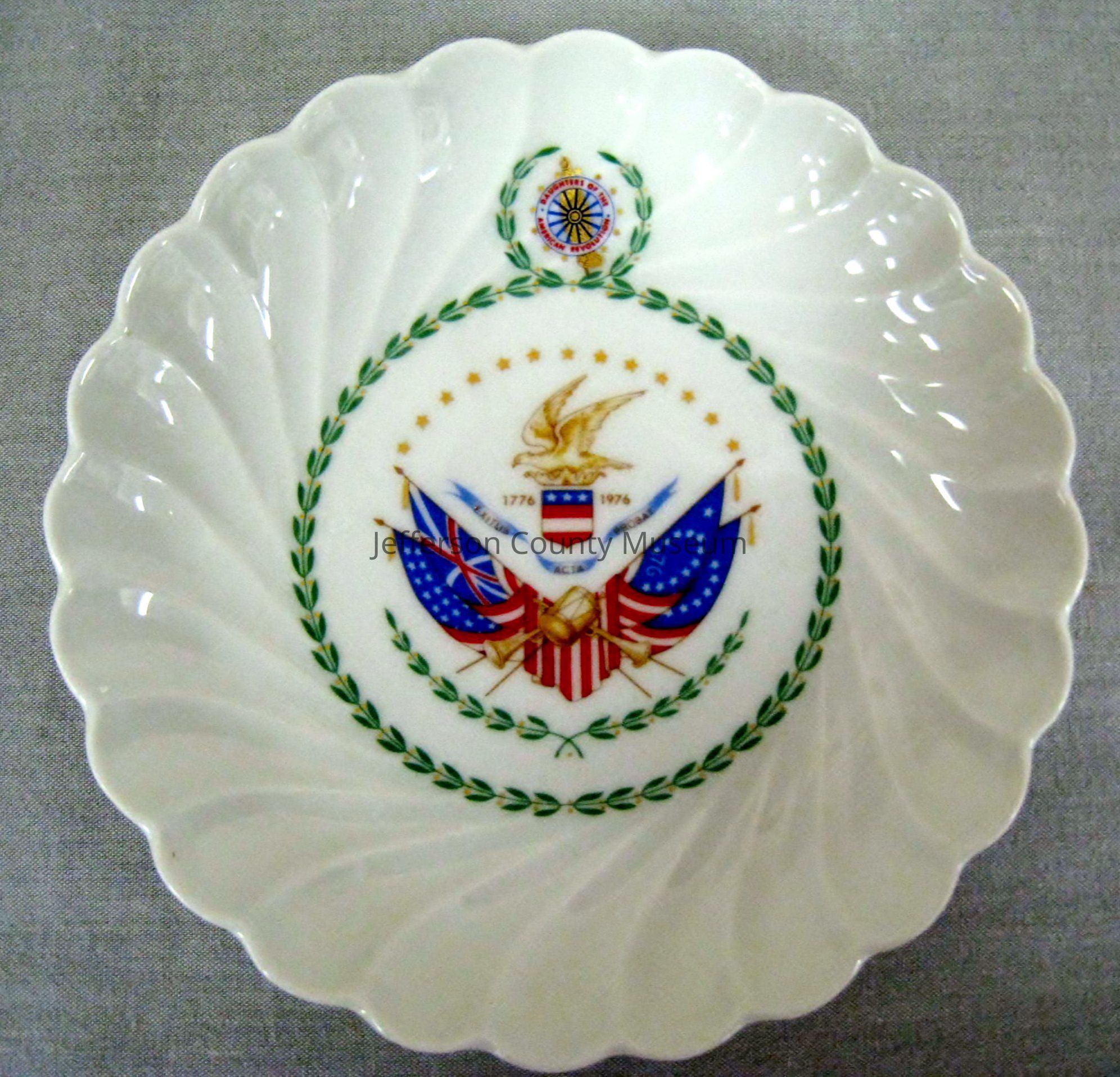 Bon-bon dish, Haviland Limoges. White China with a design of green laurel wreath, crossed flags and an eagle surmounting a shield. On back Haviland LIMOGES 89/200 Made exclusively for National Society Daughters of the American Revolution on the occasion of the United States of America Bicentennial 1776-1976 Haviland France. Signed Frederick Haviland 4-17-72.