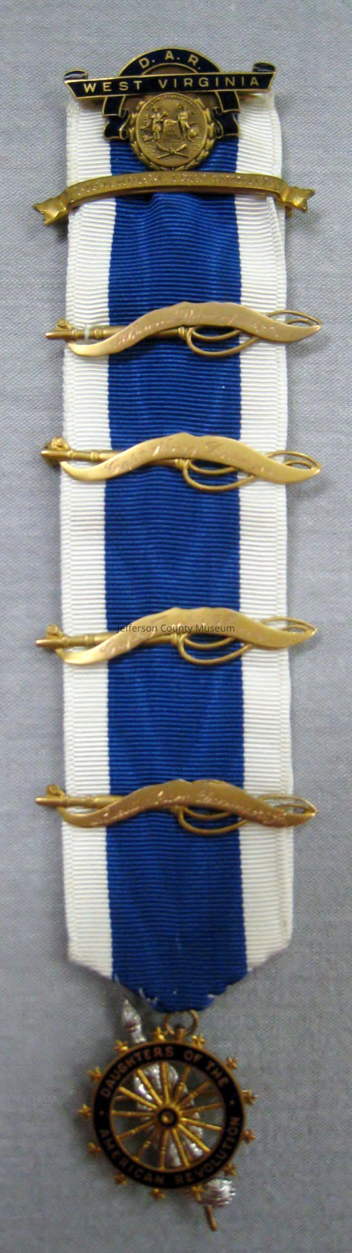 DAR ancestor ribbon for Susan Gregg Gibson. Blue and white ribbon has four metal bars, three ancestor bars and one chapter bar (Bee Line Chapter). Wheel-shaped emblem of the DAR on the base. 14k gold. Top bar says D.A.R. WEST VIRGINIA. Below that is state seal, next bar says PACK HORSE FORD CHAPTER, next says Abram Davenport, Sr., next says Capt. Henry Bedinger, next Capt. James Strode, last says Lieut. Abram Davenport, Jr.Acquisition