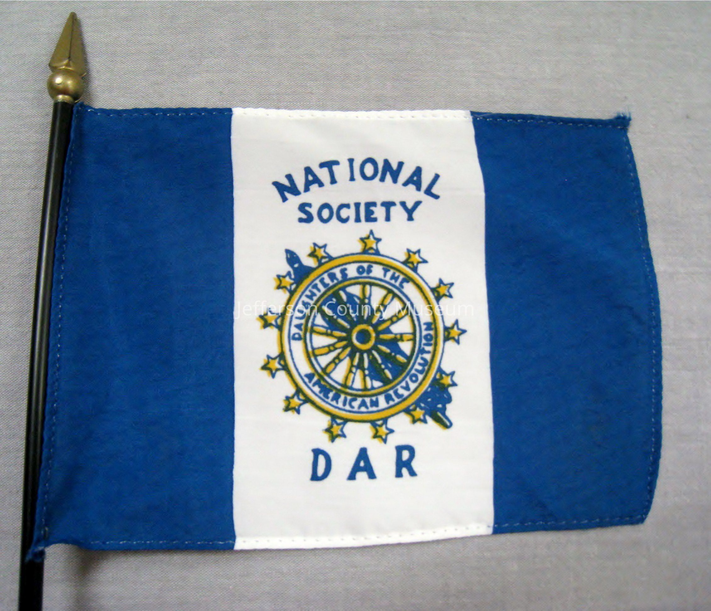Blue and white miniature DAR flag on black plastic stand. In center of flag is wheel symbol of DAR with 13 stars around it and furled flag behind. Around wheel is DAUGHTERS OF THE AMERICAN REVOLUTION. Above wheel NATIONAL SOCIETY. Below wheel DAR.Acquisition