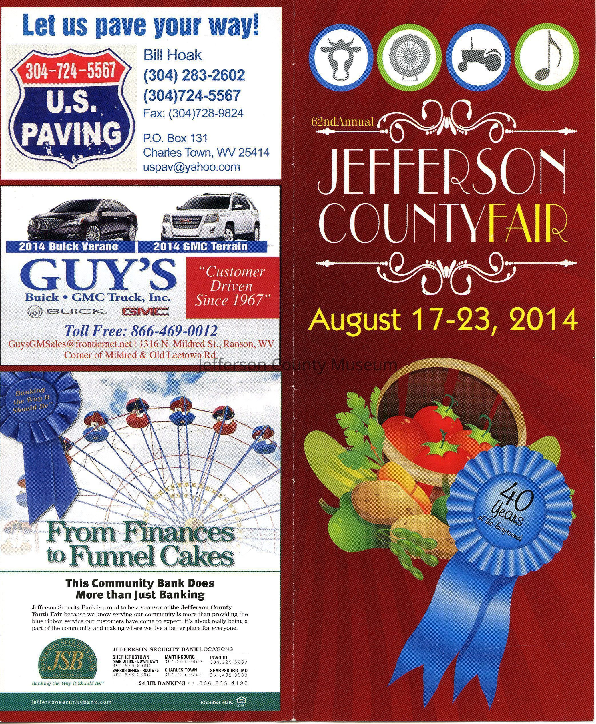 Fold-out brochure for the 62nd annual Jefferson County Fair held in Jefferson County, West Virginia. Printed in color on glossy paper. Includes a schedule of events for the fair held on August 17 through August 23, 2014. Produced by the Jefferson County Fair Association, established in 1953. Opposite side of brochure includes a map of the fair grounds and ads for fair sponsors.Acquisition