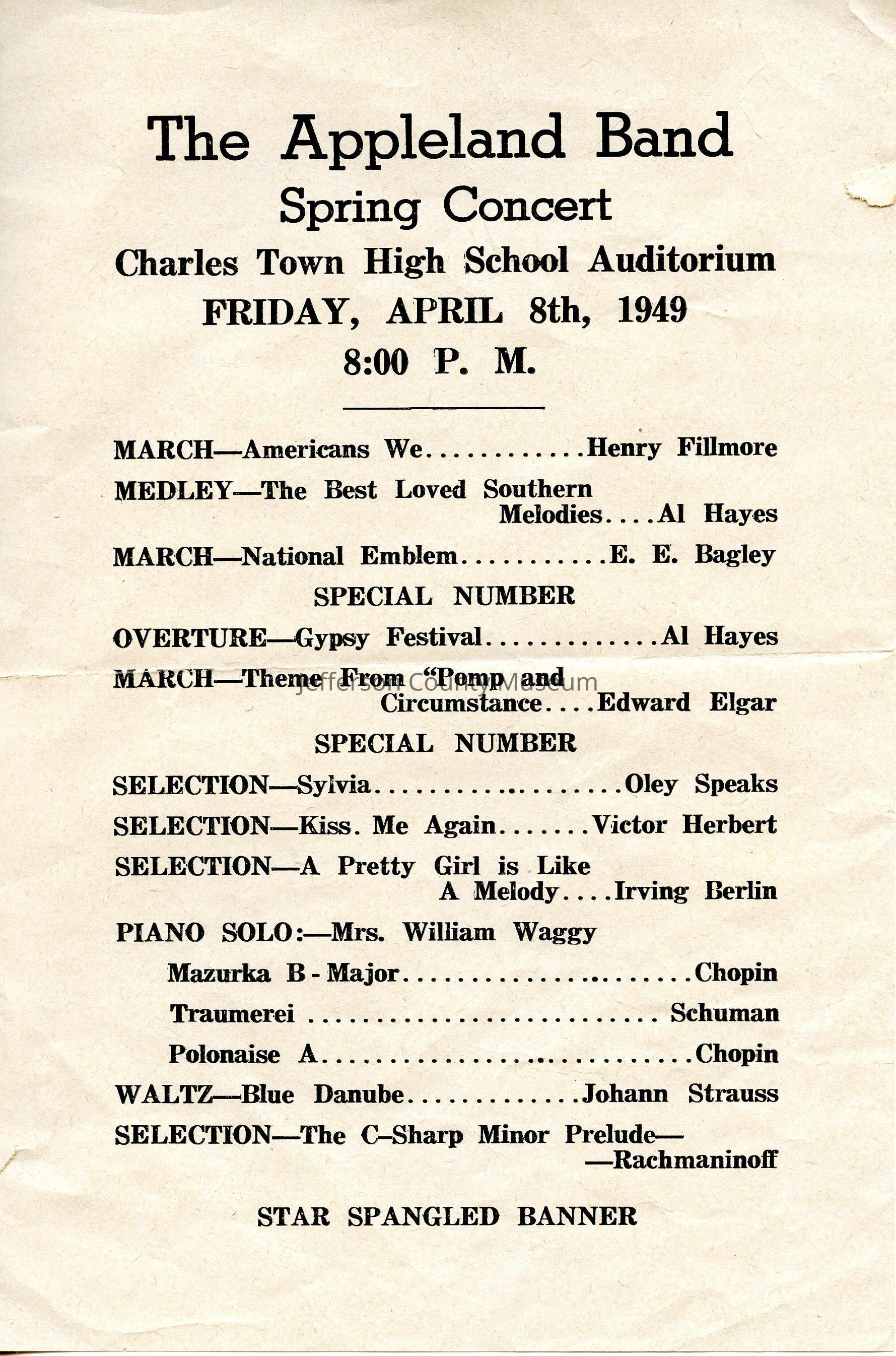 Program for "The Appleland Band Spring Concert Charles Town High School Auditorium FRIDAY, APRIL, 8th, 1949 8:00 P. M." Includes list of events and people involved.Acquisition