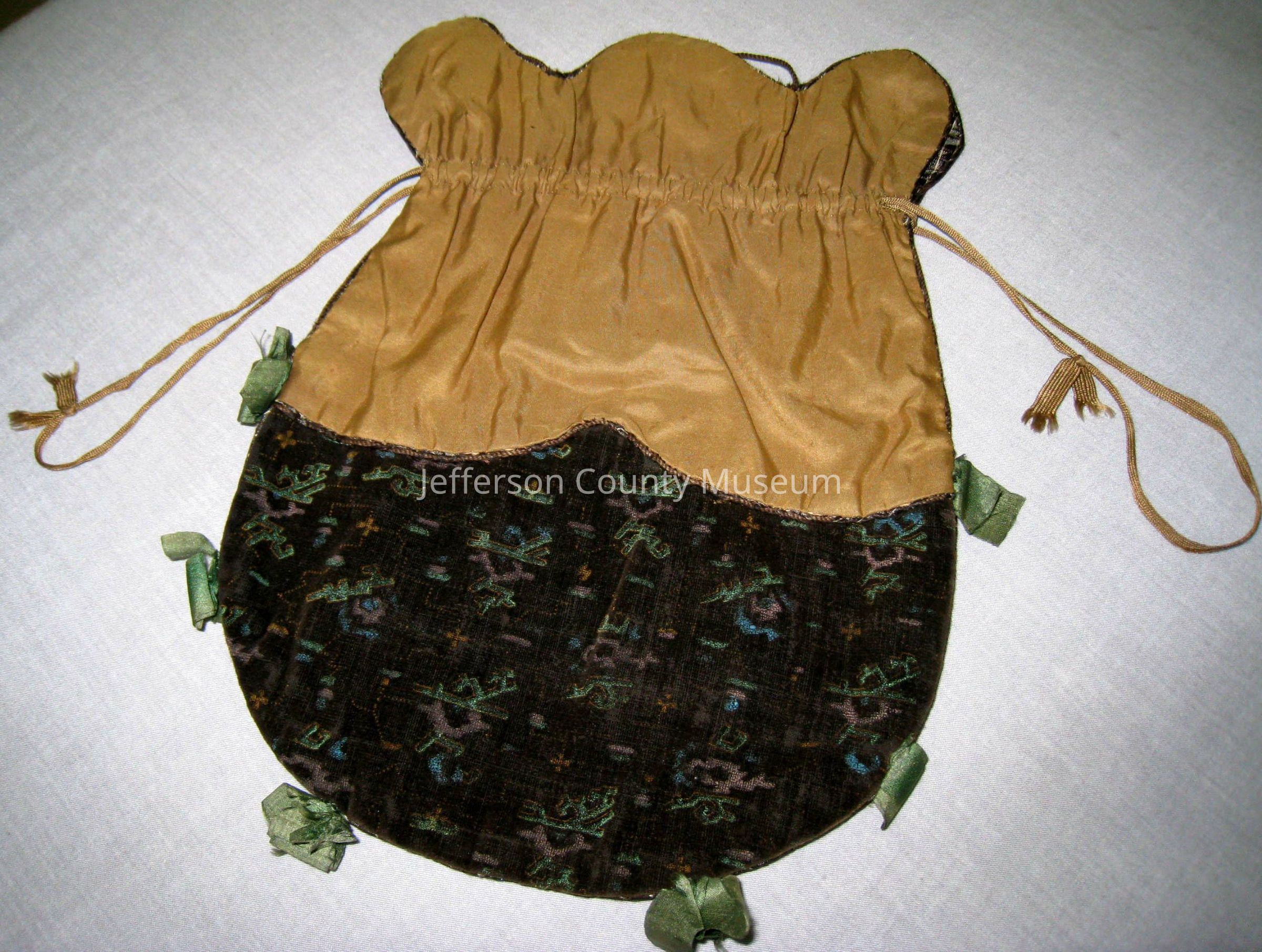 Drawstring purse (reticule). Silk on top half and brown velvet material on bottom with blue and green decoration. Green Silk ribbon decoration around velvet. Light and Dark brown checked material sewn to inside of top.Acquisition