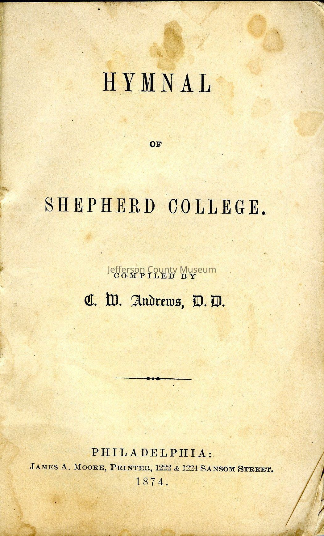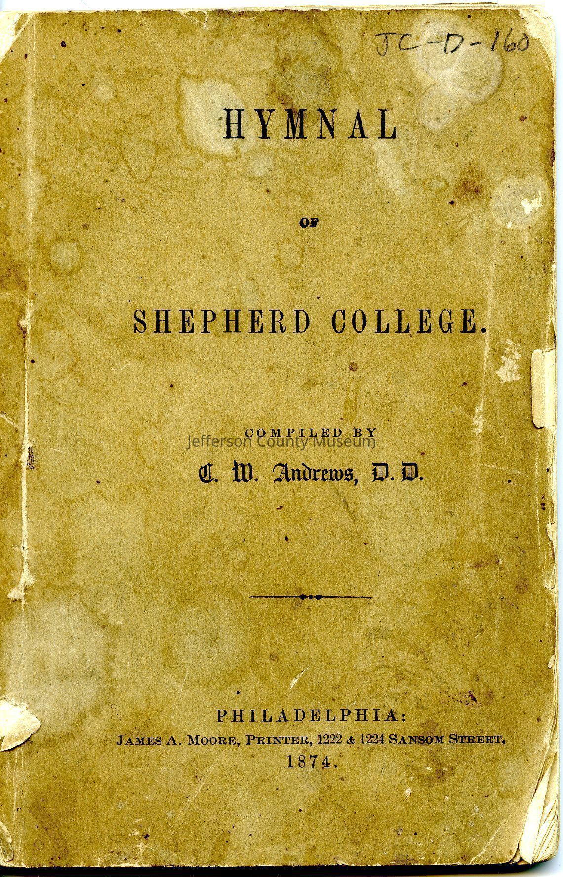Paperback "Hymnal OF SHEPHERD COLLEGE Compiled BY C.W. ANDREWS, D.D. PHILADELPHIA: JAMES A. MOORE, PRINTER, 1222 & 1224 SANSOM STREET. 1874." 217 pages shown but starts with page 147.Acquisition