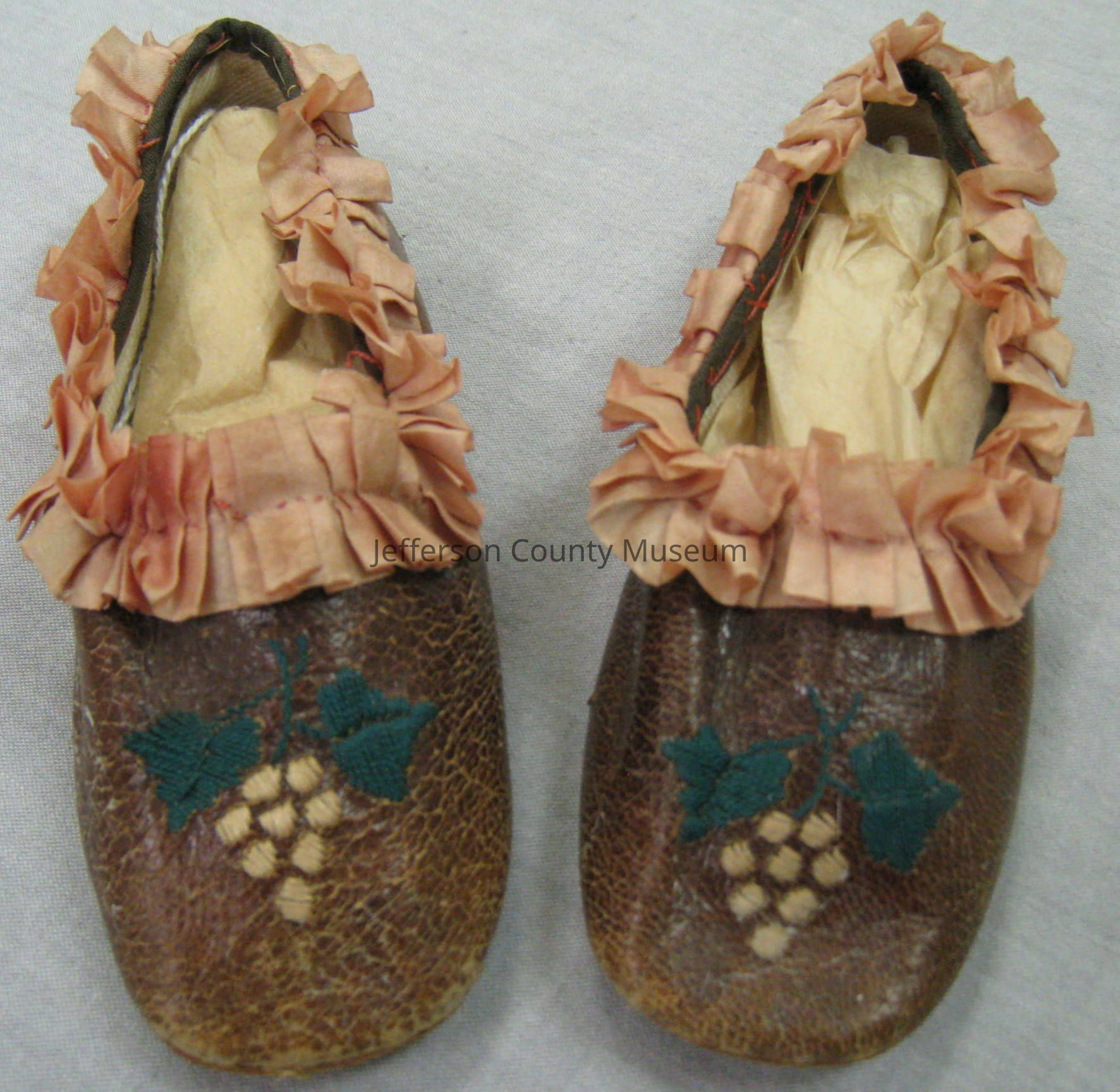 Child's leather and silk shoes or slippers. A silk fringe is sewn to the top of the shoe. Two green leaves and tan berries are embroidered on the instep.Acquisition