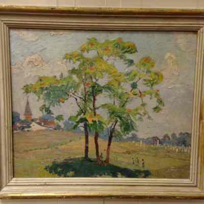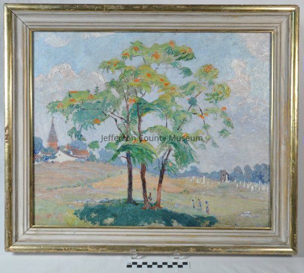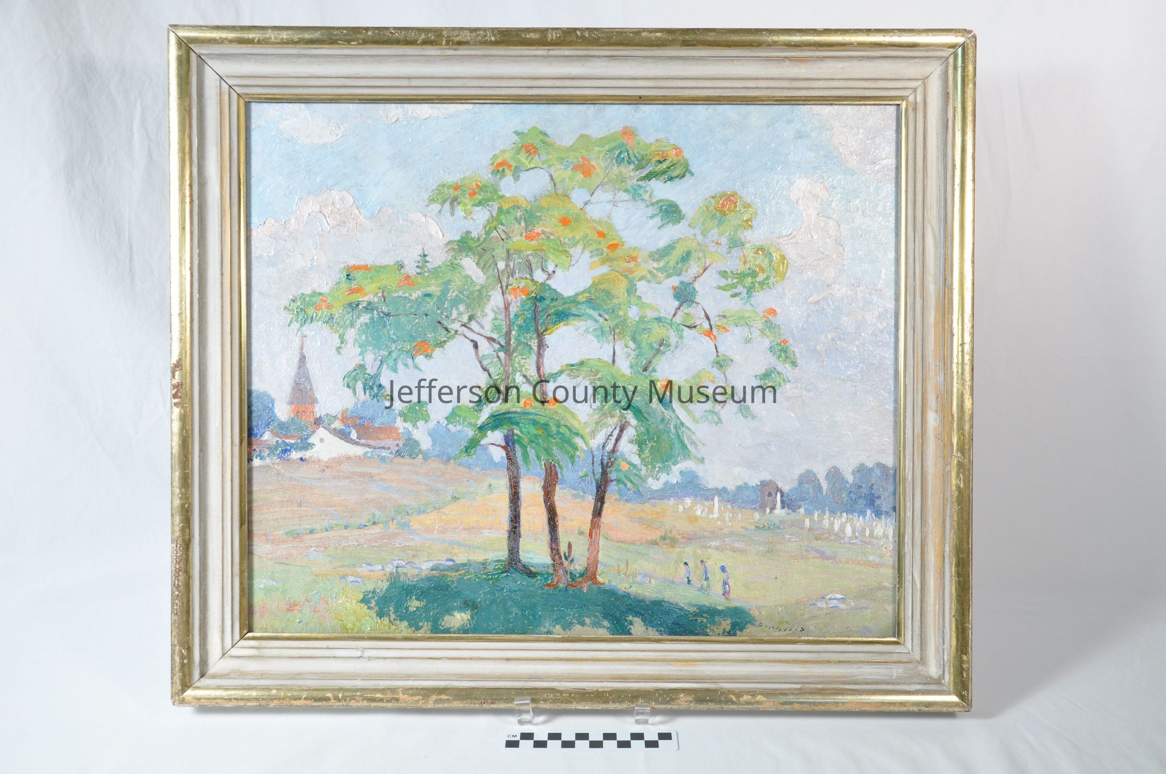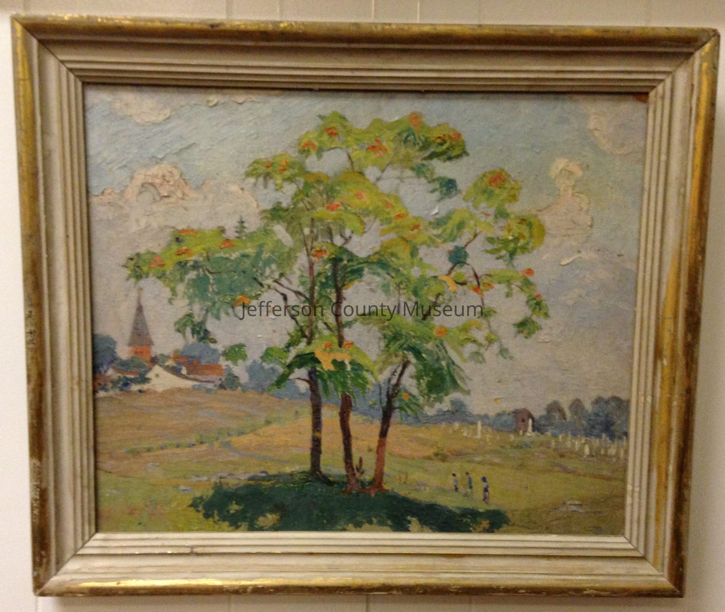 Three trees, Zion Church steeple in left background, Edge Hill Cemetery in right foreground, and three loosely defined figures just to right of trees. Painted by Patty Willis, Jefferson County native.
