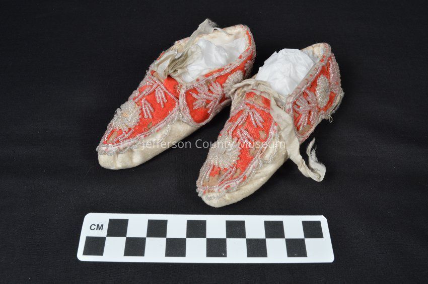 Child's rawhide leather moccasins. Red fabric sewn to instep and sides. Clear beads are sewn in patterns on the red fabric. Many holes on fabric and leather.Acquisition