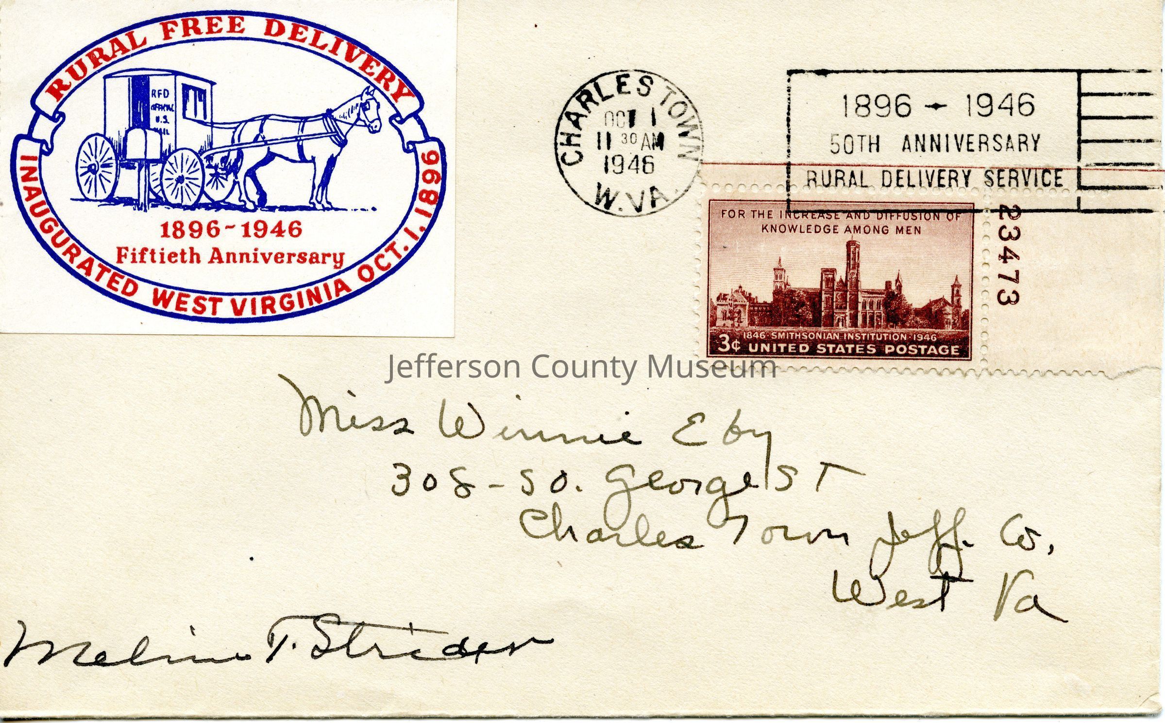 Envelope with first day cover for 50th anniversary of Rural Free Delivery which was inaugurated in West Virginia October 1, 1896; sticker with cachet is in upper left corner; cancelled in Charles Town October 1, 1946. Three-cent stamp with Smithsonian Institution Castle on it is afixed to envelope. Addressed to "Miss Winnie Eby, 308 - So. George St., Charles Town Jeff. Co. West Va" The name "Melvin T. Strider" is at bottom left.Acquisition