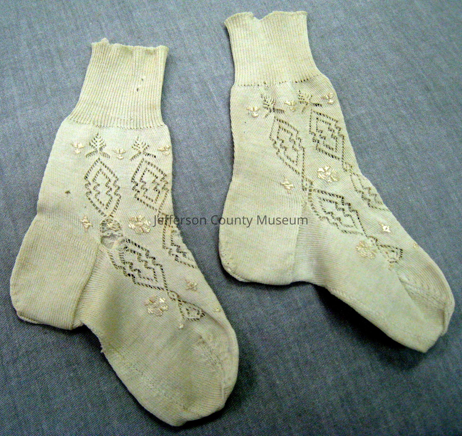 Child's white cotton or linen socks. Diamond and other designs woven into instep up to ankle.Acquisition