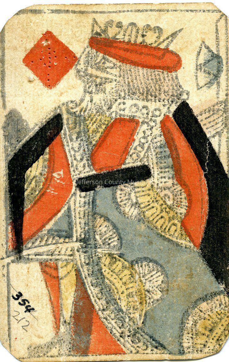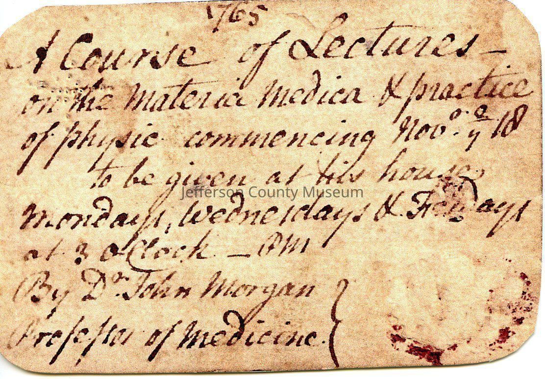 A playing card with an invitation on the back. On the playing side is a King painted red, black, yellow, gray, and white. In the upper left corner in the diamond is 20 tiny holes (possible pinholes). On the blank side is a hand written invitation that states: "1765, A Course of Lectures, on the materia medica & practice, of physic commencing Nov. (00/7 18)(?), to be given at his house, Mondays, Wednesdays, Fridays, at 3 o'clock PM, By Dr. John Morgan, Professor of Medicine." On old catalog card it is listed as being rare. Colonial period- VirginiaAcquisition