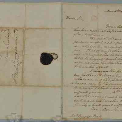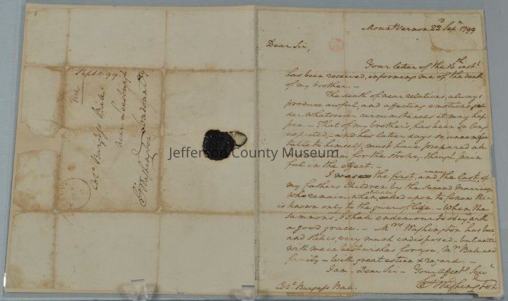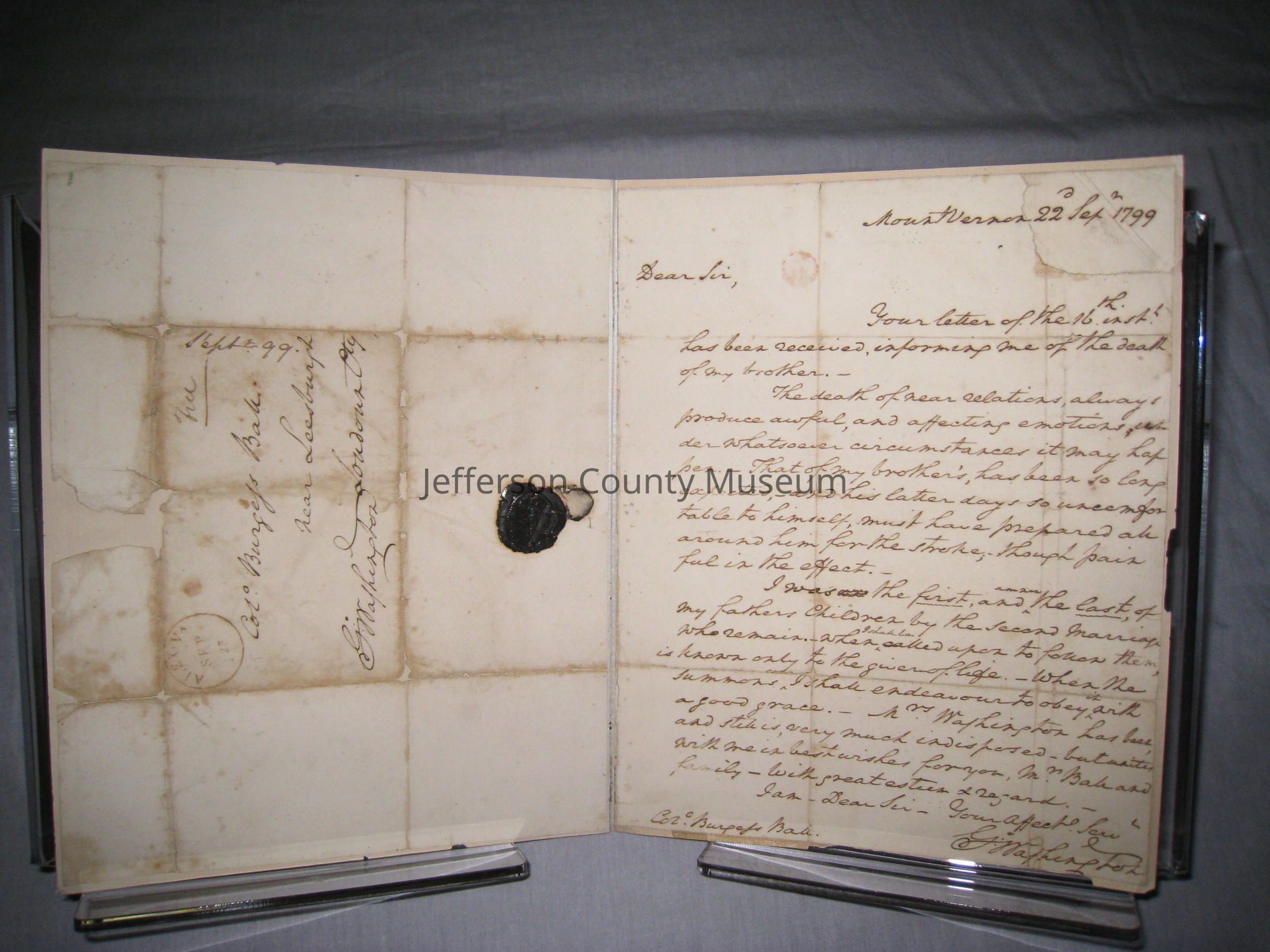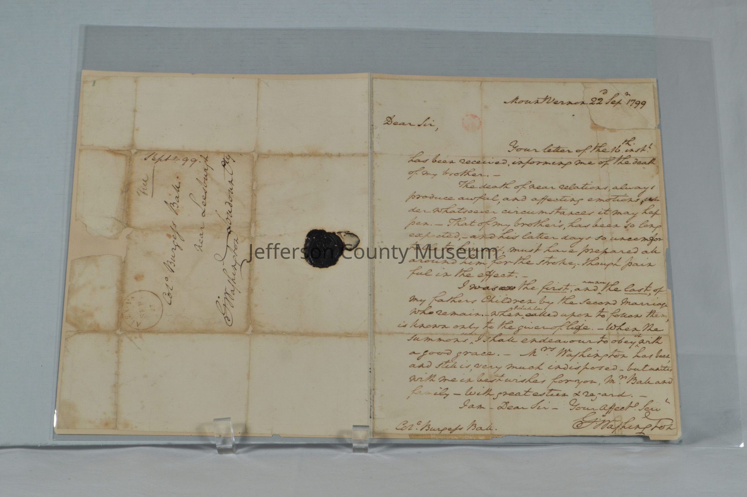 Handwritten letter from George Washington to his cousin, Col. Burgess Ball, at "Leesburgh". Dated September 22, 1799. Postmarked Alexandria, VA with Washington's signature beneath the address and on the letter. Also shows remains of Washington's seal. George Washington is writing about the death of his brother Charles. Burgess Ball was also the son-in-law of Charles, having married Charles's daughter Frances.Acquisition