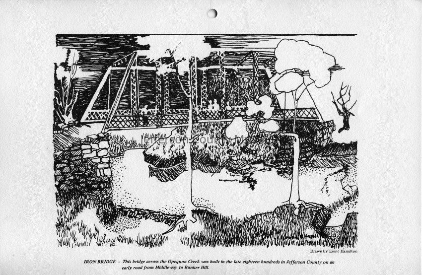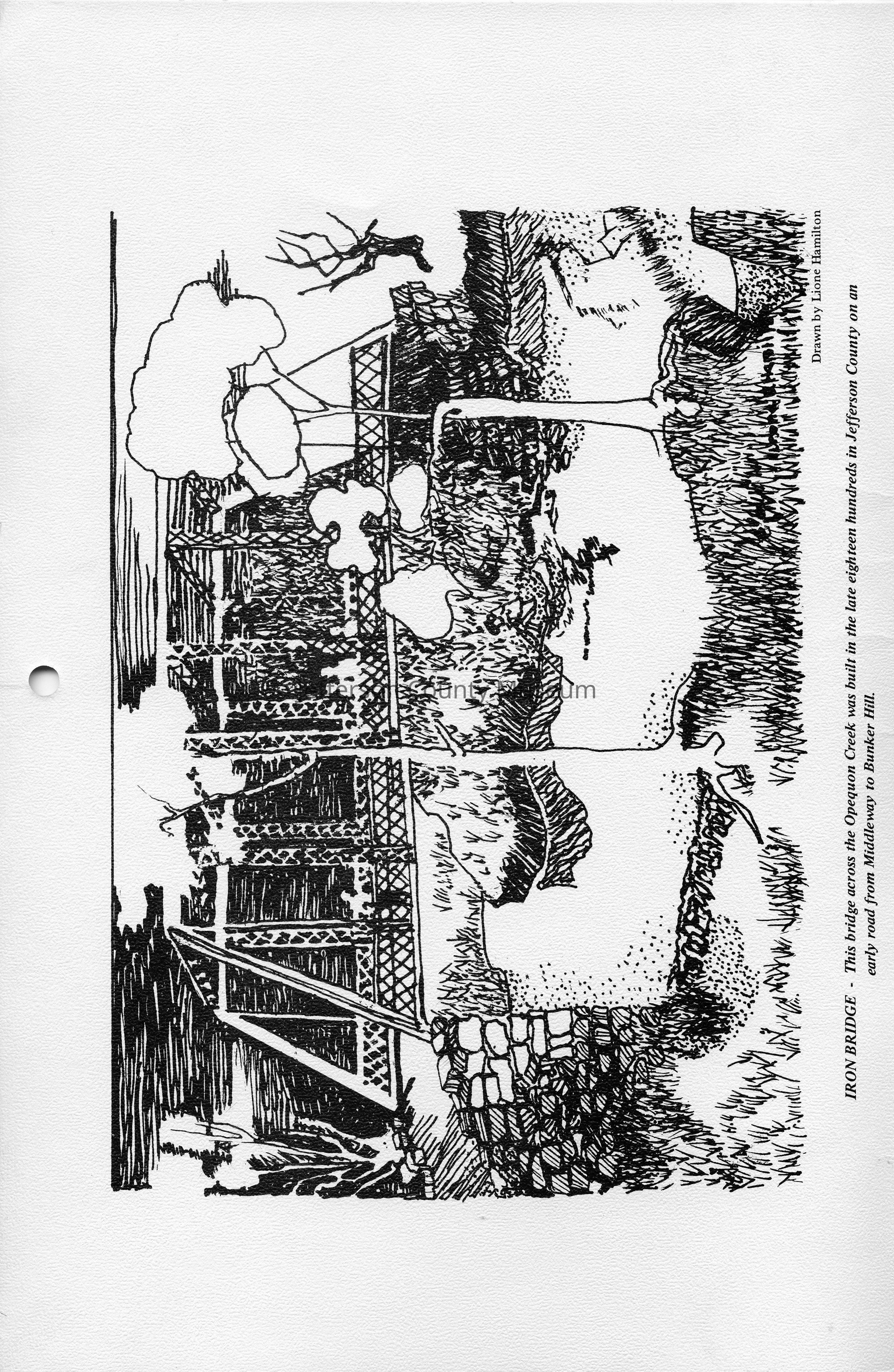 Iron Bridge - this bridge across the Opequon Creek was built in the late eighteen hundreds in Jefferson county on an early road from Middleway to Bunker Hill. Drawn by Lione (Leone) Hamilton.