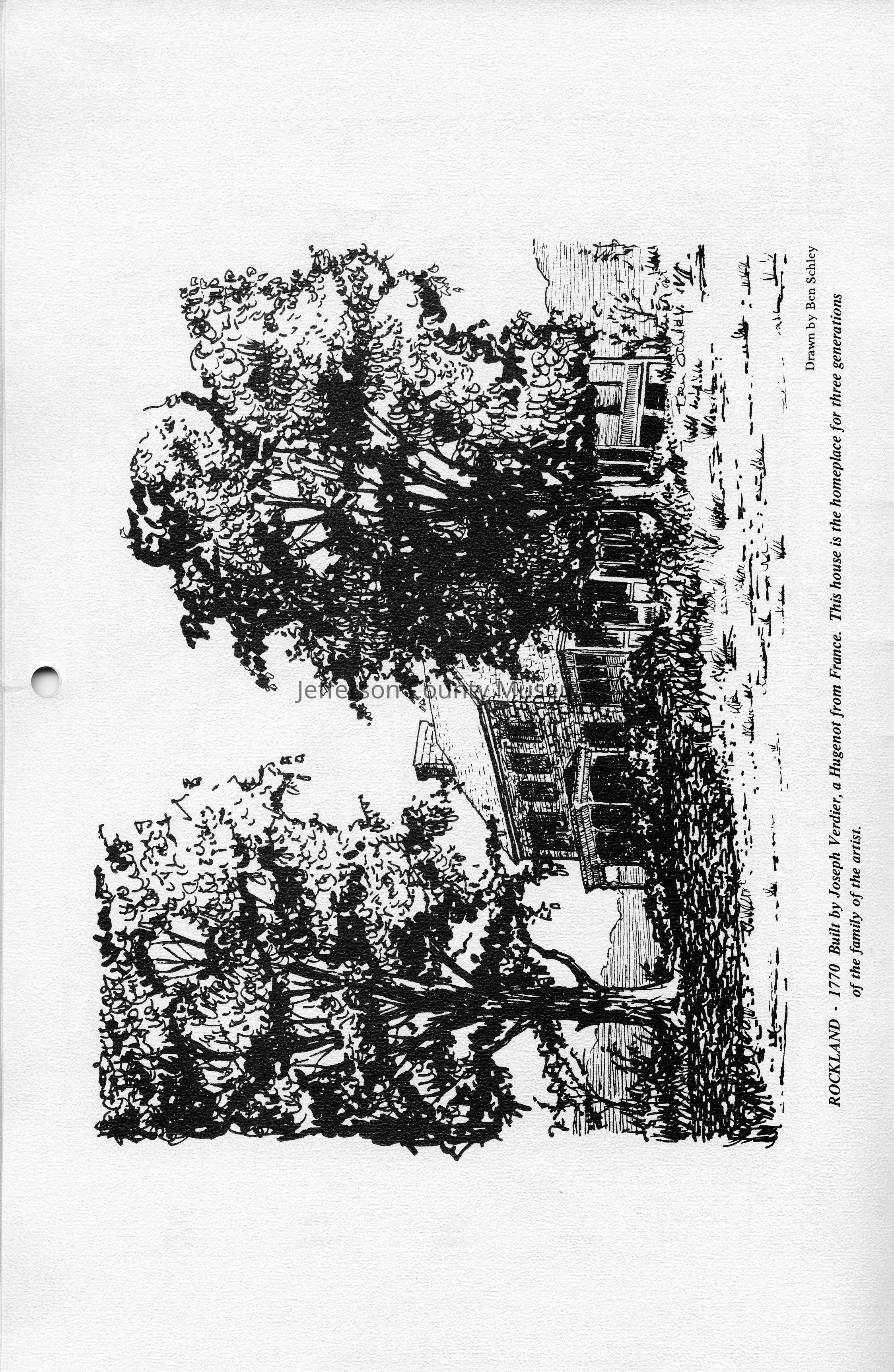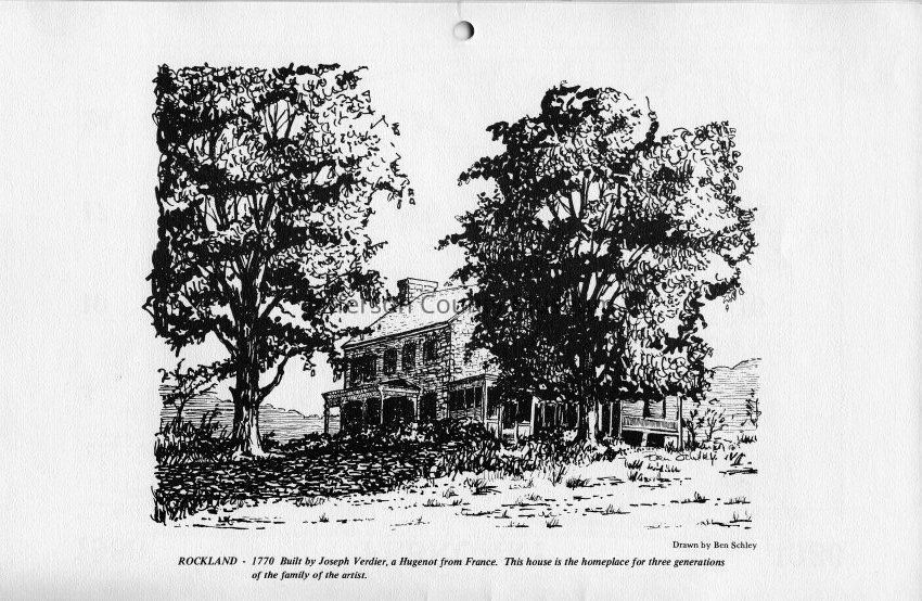 Rockland - 1770 Built by Joseph Verdier, a Huguenot from France. This house is the homeplace for three generations of the family of the artist. Drawn by Ben Schley.