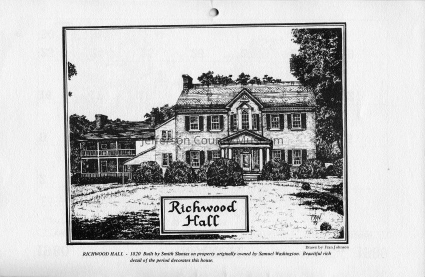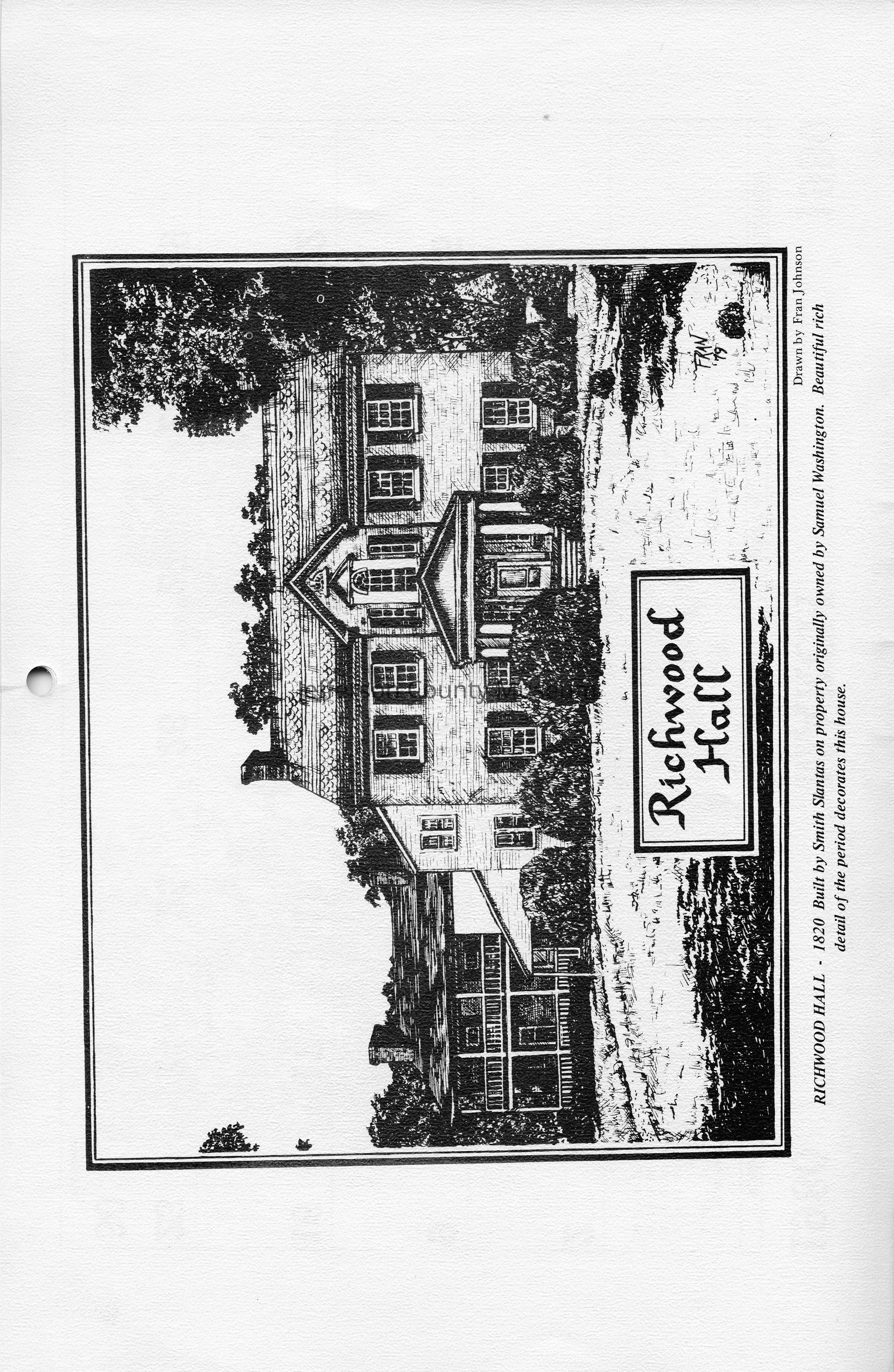 Richwood Hall - 1820 Built by Smith Slantas on property originally owned by Samuel Washington. Beautiful rich detail of the period decorates this house. Drawn by Fran Johnson.
