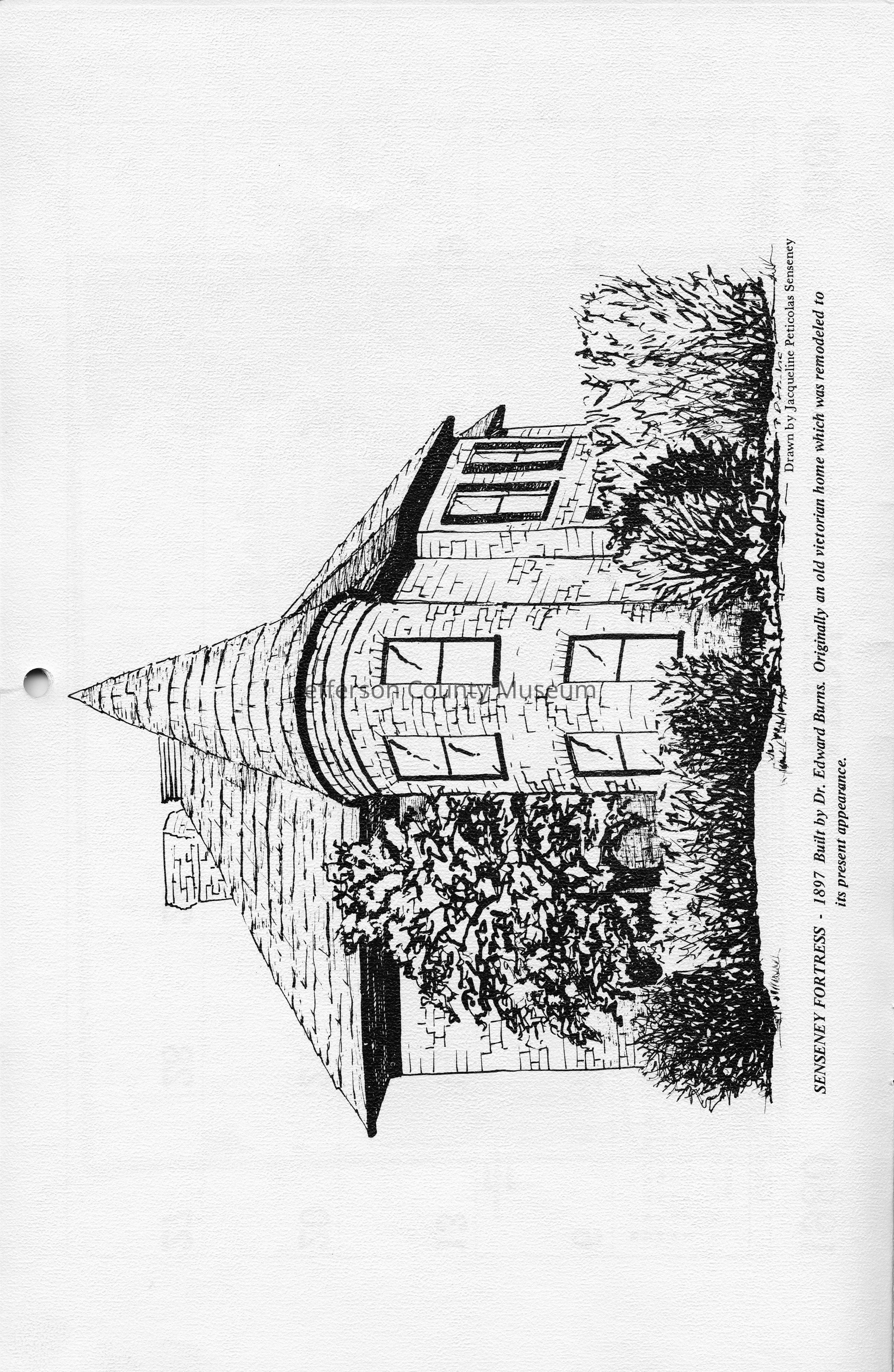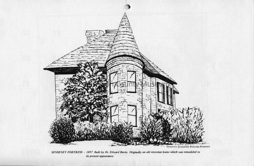Senseney Fortress - 1897 Built by Dr. Edward Burns. Originally an old Victorian home which was remodeled to its present appearance. Drawn by Jacqueline Petiticolas Senseney.