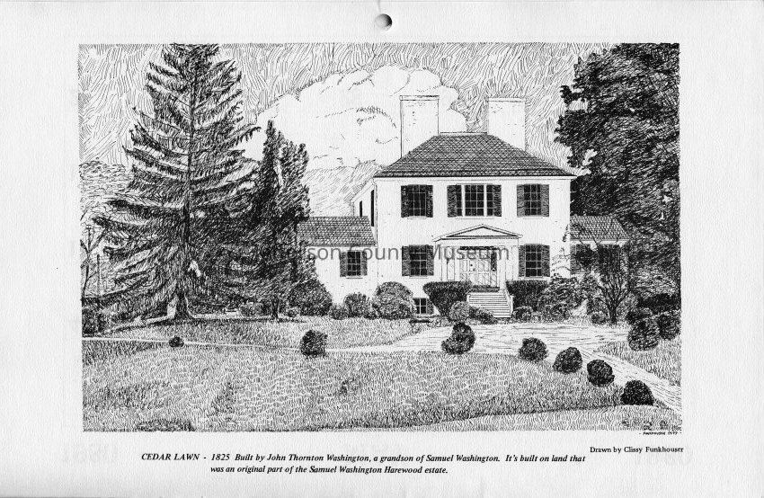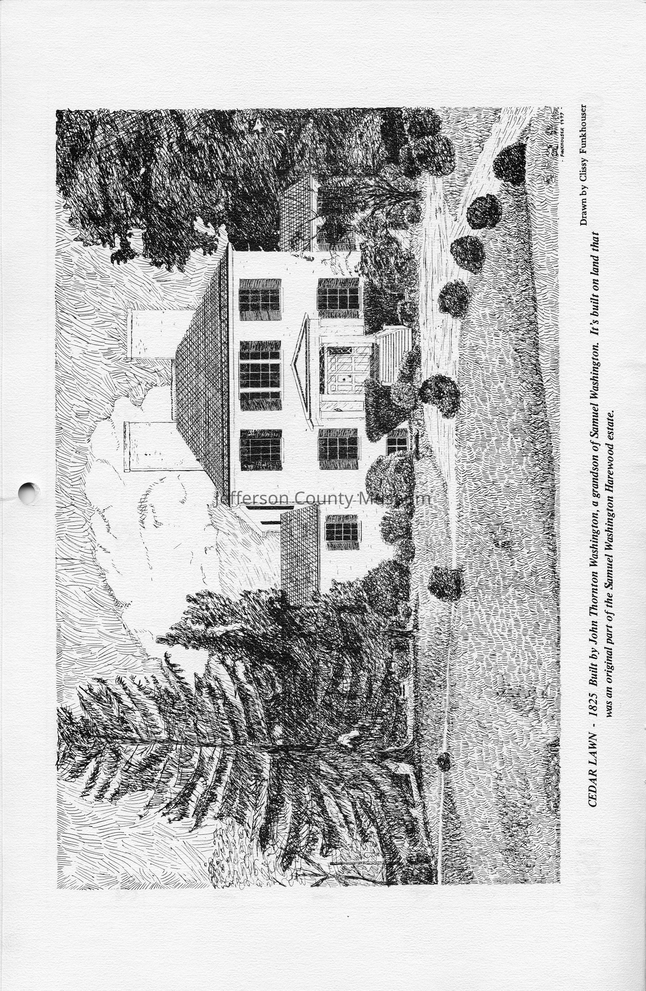 Cedar Lawn - 1825 Built by John Thornton Washington, a grandson of Samuel Washington. It's built on land that was an original part of the Samuel Washington Harewood estate. Drawn by Clissy Funkhouser.