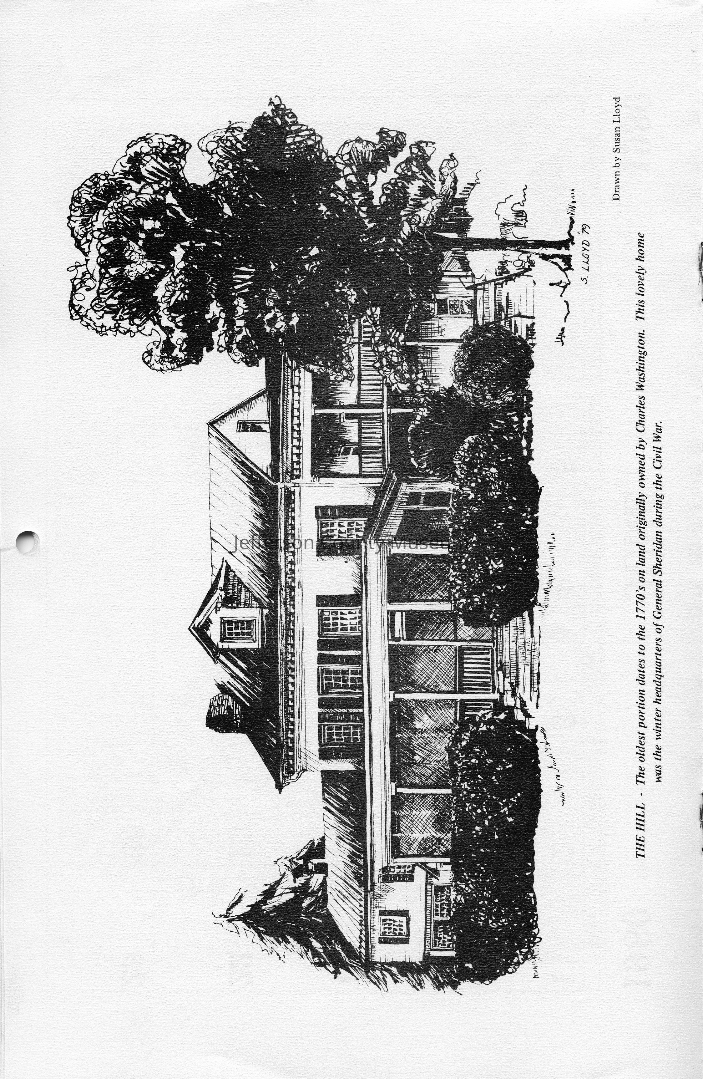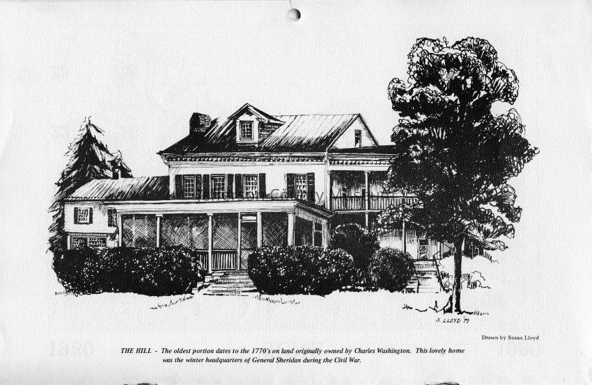 The Hill - The oldest portion dates to the 1770's on land originally owned by Charles Washington. This lovely home was the winter headquarters of General Sheridan during the Civil War. Drawn by Susan Lloyd.