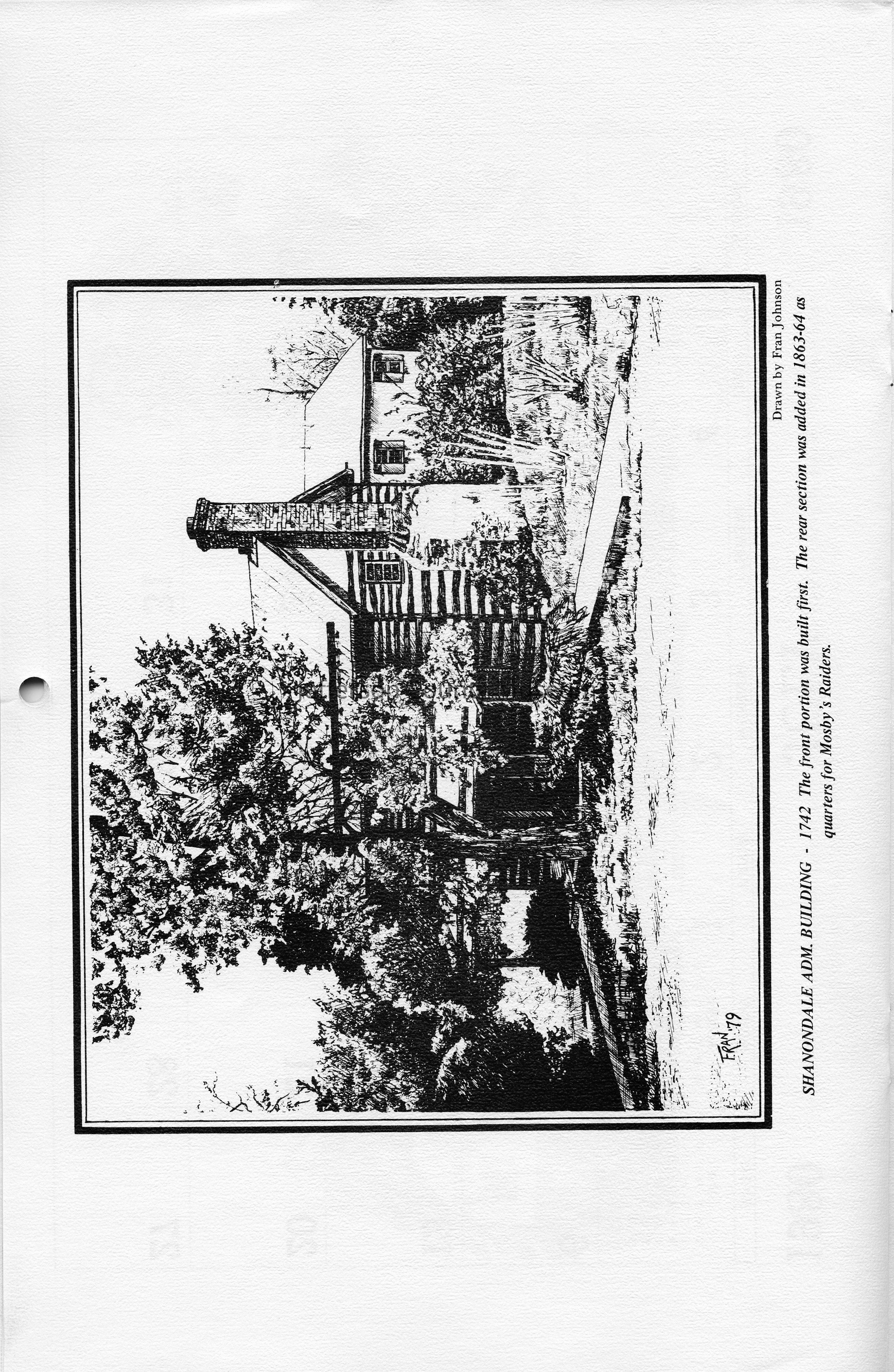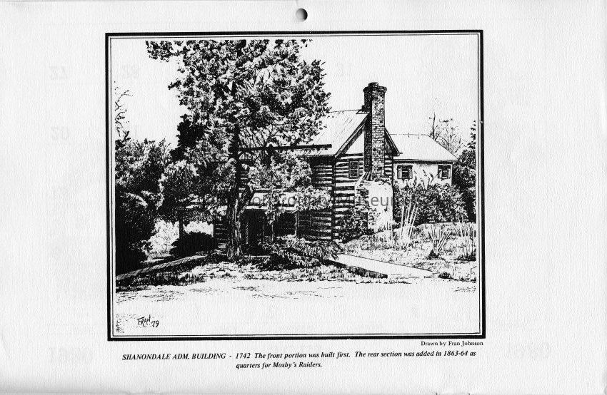 Shanondale [sic] Adm. Building - 1742 The front portion was built first. The rear section was added in 1863-64 as quarters for Mosby's Raiders. Drawn by Fran Johnson.