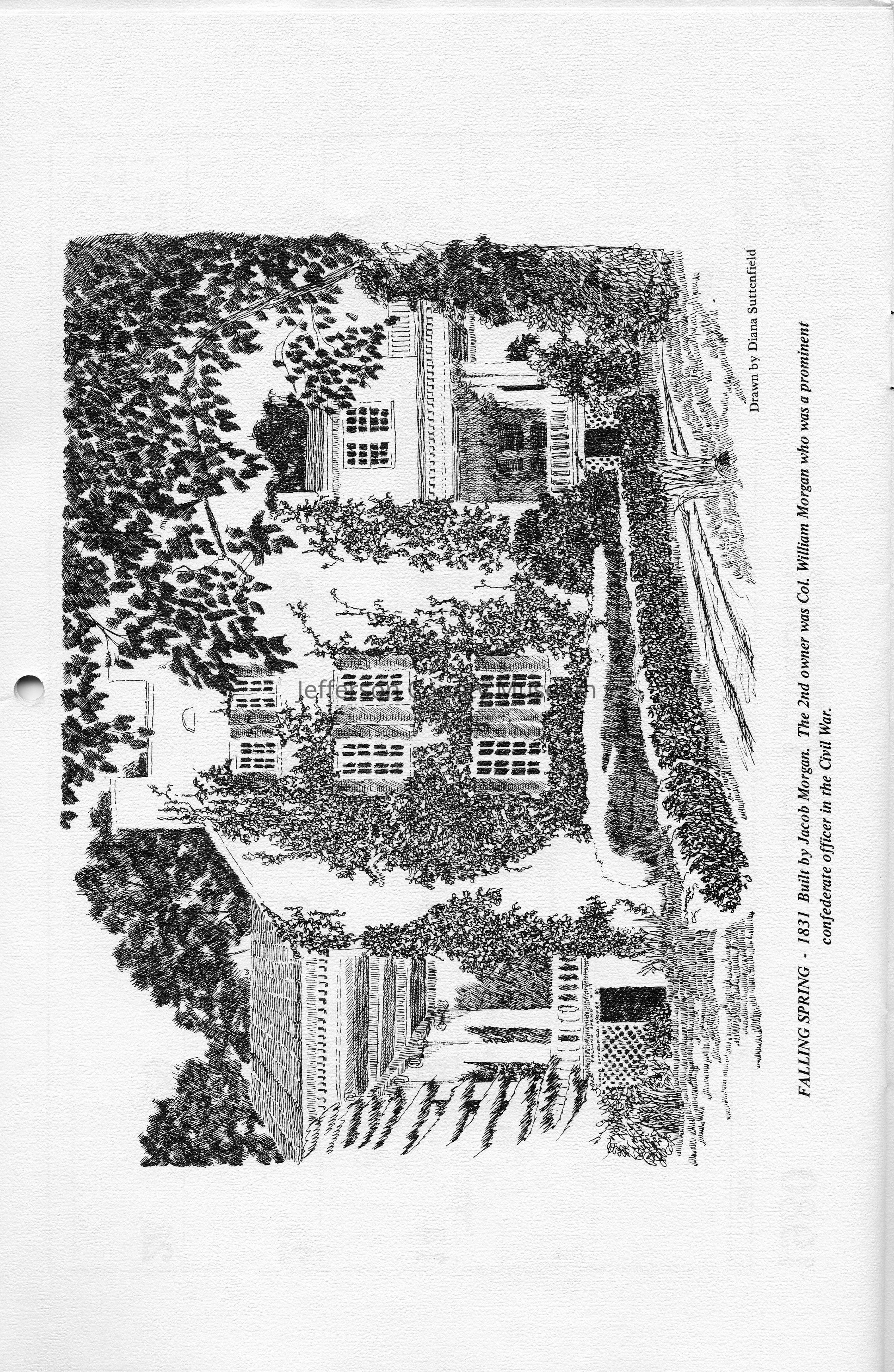Falling Spring - 1831 Built by Jacob Morgan. The 2nd owner was Col. William Morgan who was a prominent confederate officer in the Civil War. Drawn by Diana Suttenfield.