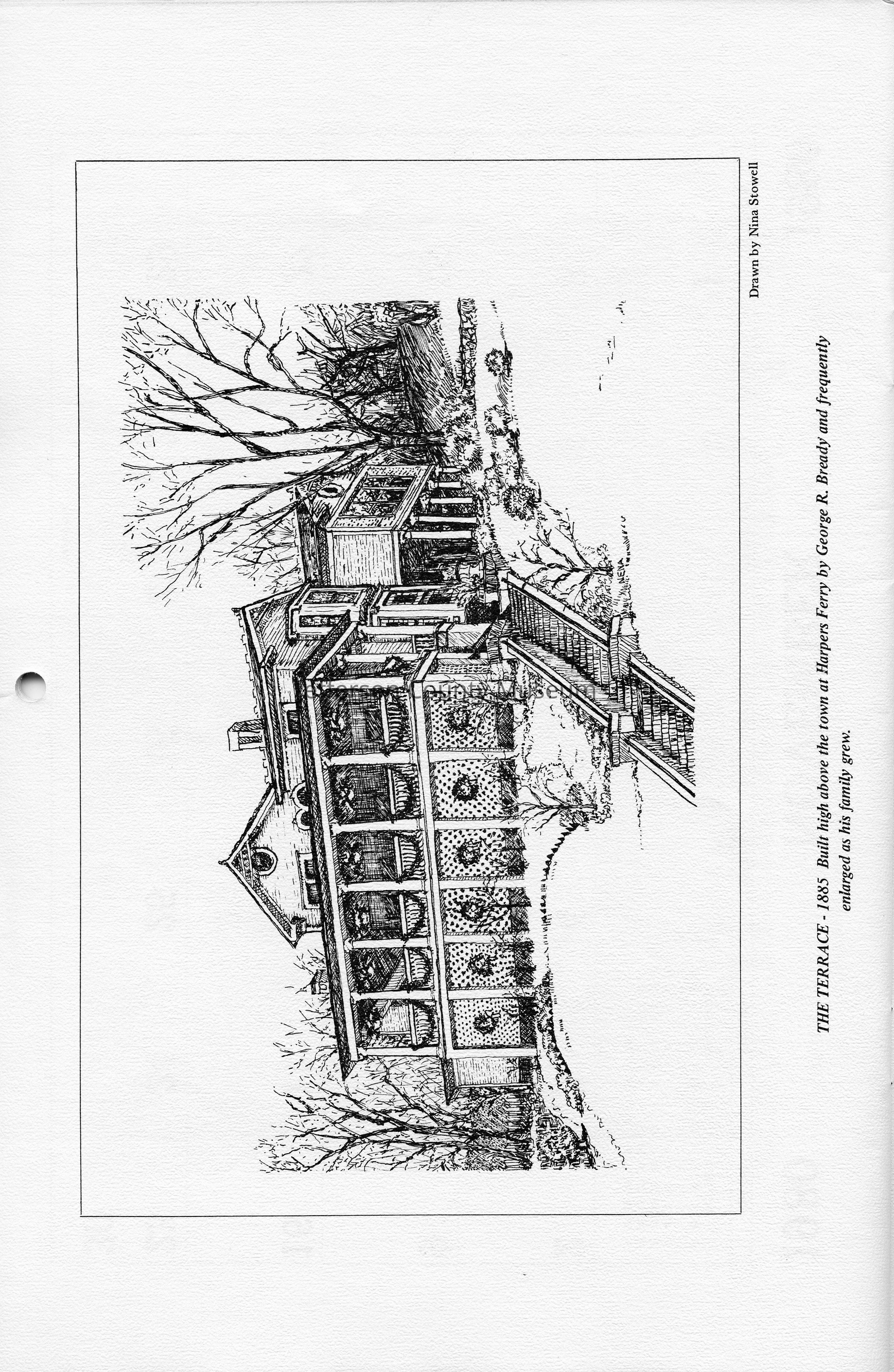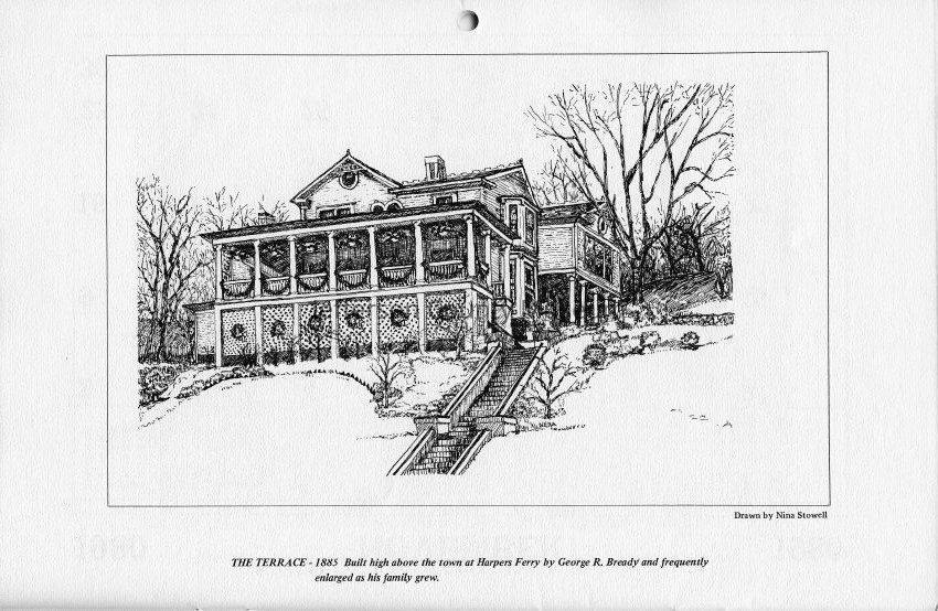 The Terrace - 1885 Built high above the town at Harpers Ferry by George R. Bready and frequently enlarged as his family grew. Drawn by Nina (Nena) Stowell.