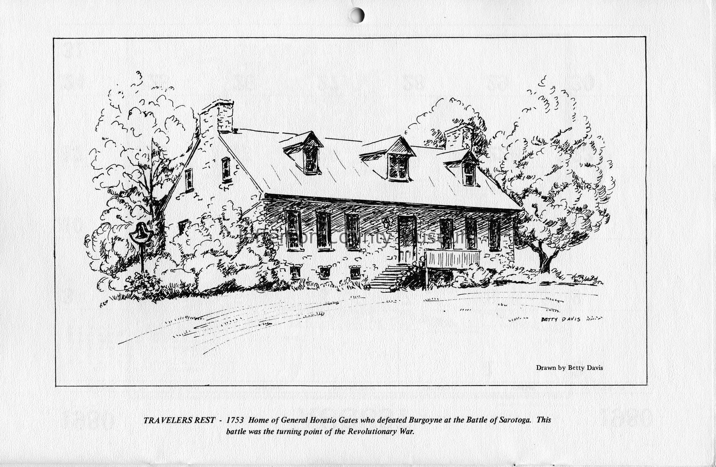 Travelers Rest - 1753 Home of General Horatio Gates who defeated Burgoyne at the Battle of Sarotoga. This battle was the turning point of the Revolutionary War. Drawn by Betty Davis.