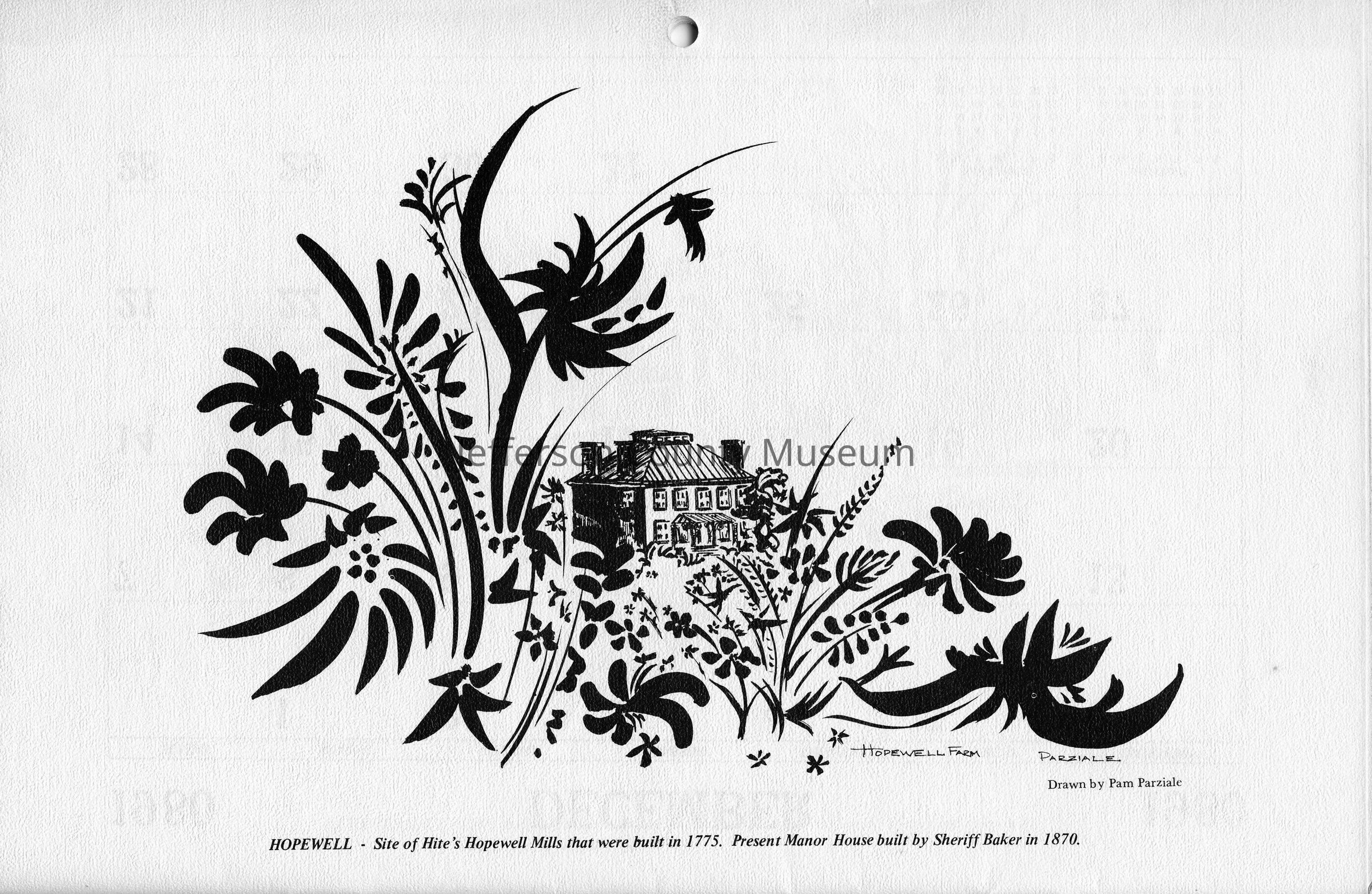 Hopewell - Site of Hite's Hopewell Mills that were built in 1775. Present Manor House built by Sheriff Baker in 1870. Drawn by Pam Parziale.Acquisition