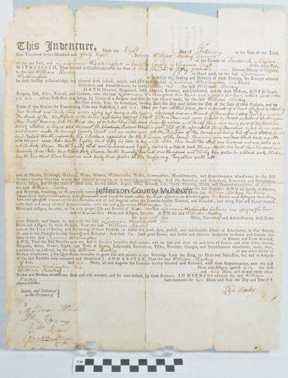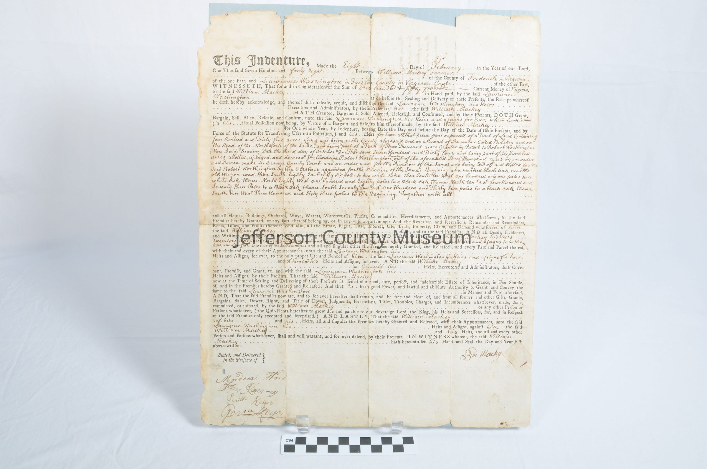Deed for the purchase of 435 acres of land on the Bullskin creek by Laurence Washington for 150 pounds. Dated February 8, 1748. Signed by "M. Macky" and witnessed by "Mordecai Ford, John Ramsey, Ruth Keyes, Gesm. (Gersham) Keyes".Acquisition
