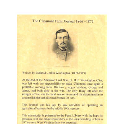 Claymont farm journal dating from 1866-1875 kept by Bushrod Corbin Washington II; primarily a record of workers' activities, such as planting and harvesting crops, cutting and hauling wood, cleaning stables, hauling logs to sawmill, fencing, feeding animals; also a record of financial transactions and comments on Sunday sermons.