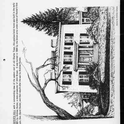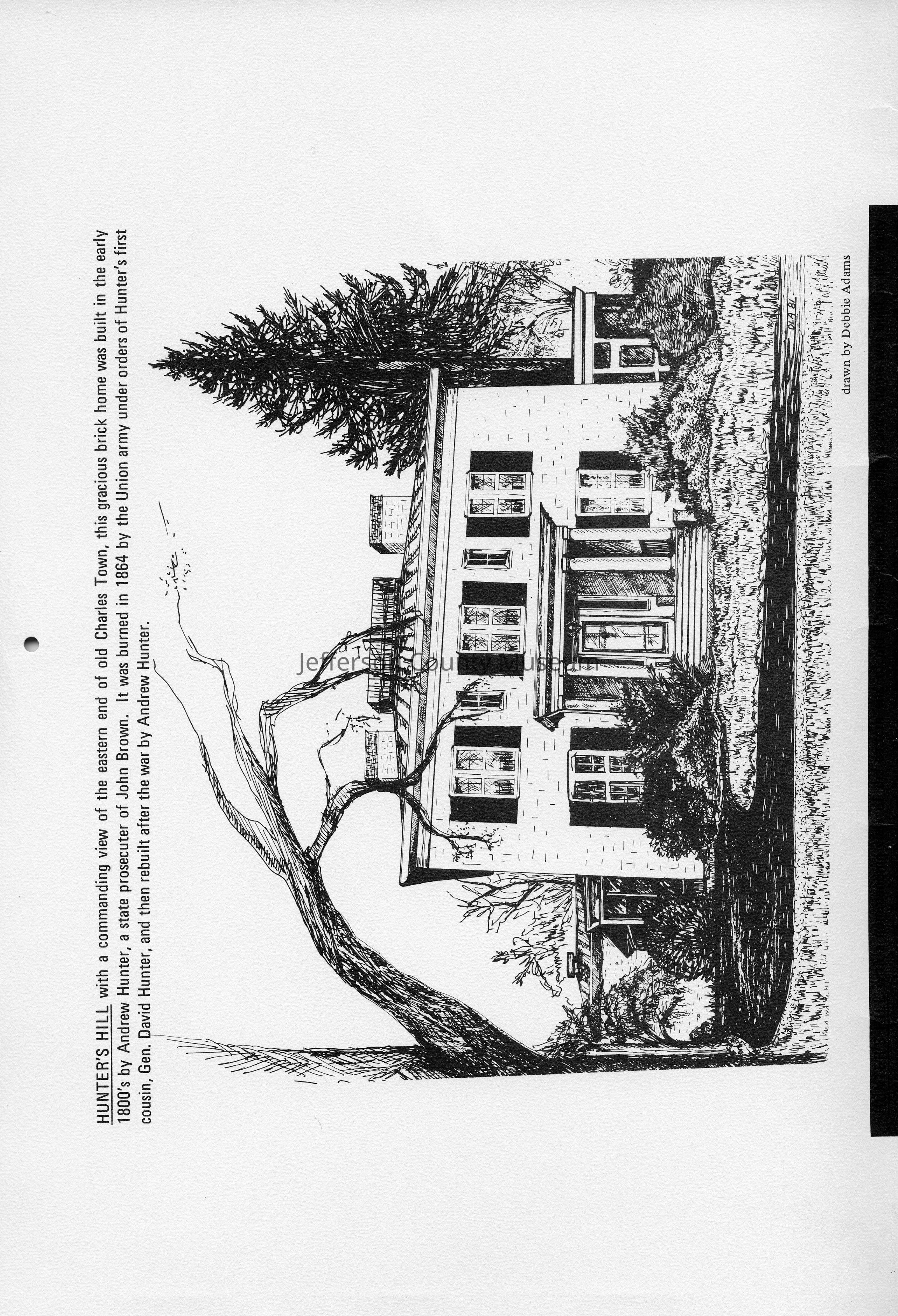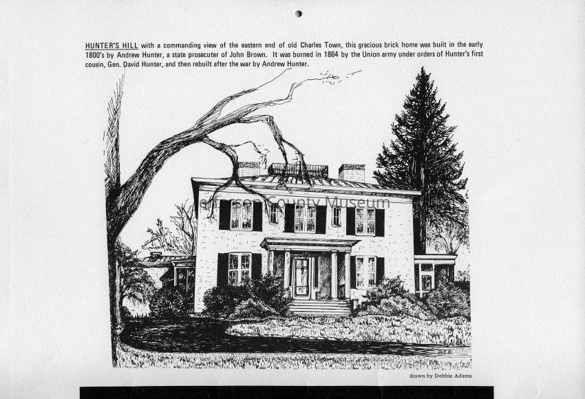 Hunter's Hill with a commanding view of the eastern end of old Charles Town, this gracious brick home was built in the early 180's by Andrew Hunter, a state prosecutor of John Brown. It was burned in 1864 by the Union army under orders of Hunter's first cousin, Gen. David Hunter, and then rebuilt after the war by Andrew Hunter. Drawn by Debbie Adams.