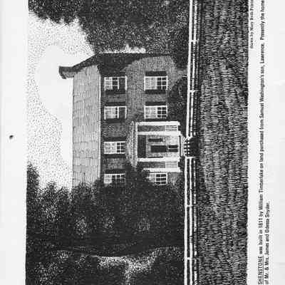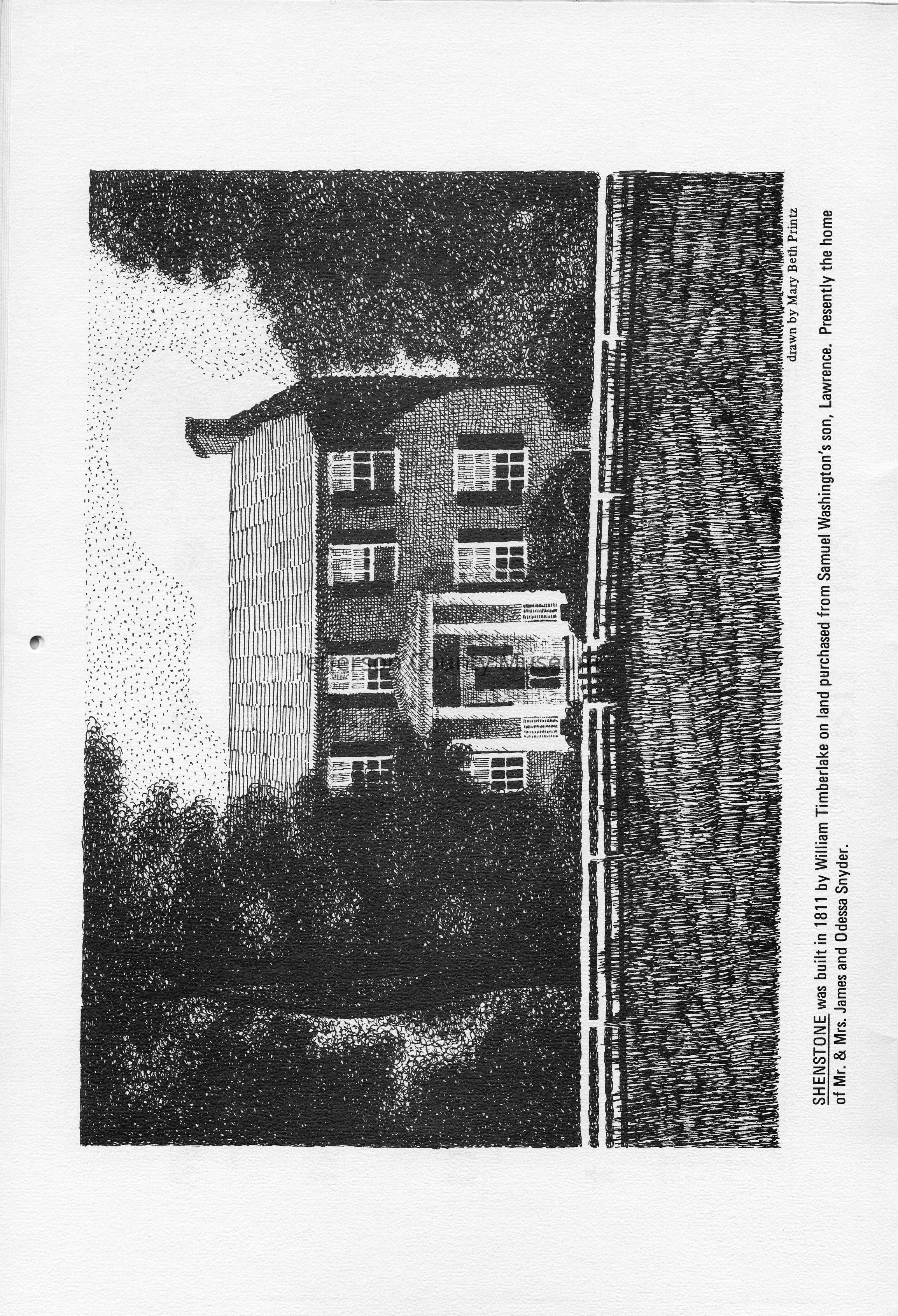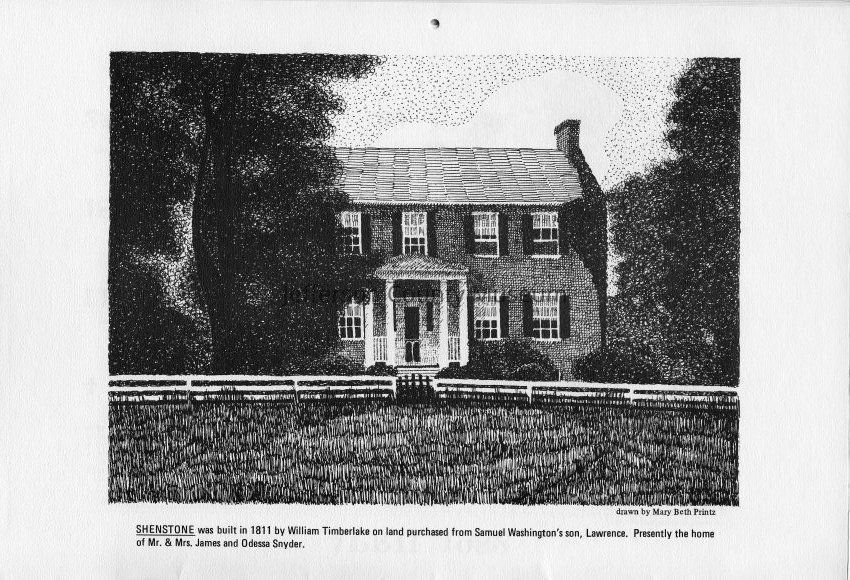 Shenstone was built in 1811 by William Timberlake on land purchased from Samuel Washington's son, Lawrence. Presently the home of Mr. and Mrs. James and Odessa Snyder. Drawn by Mary Beth Printz.