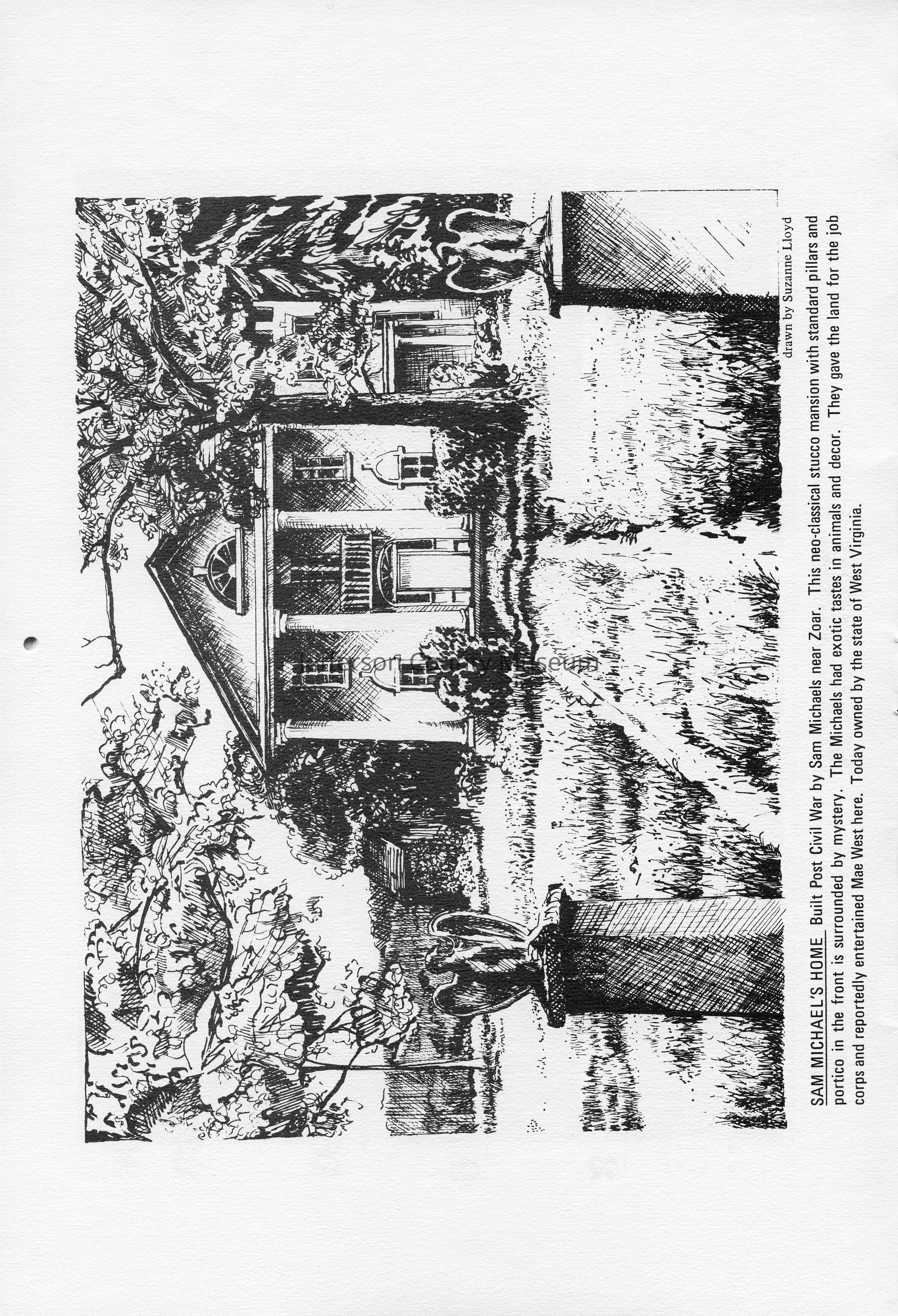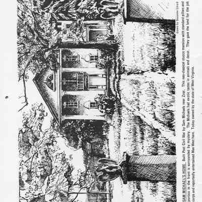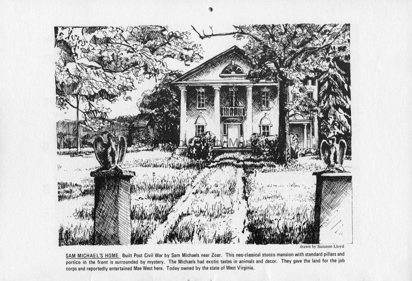 San Michaels' Home - Built Post civil War by Sam Michaels near Zoar. This neo-classical stucco mansion with standard pillars and portico in the front is surrounded by mystery. The Michaels had exotic tastes in animals and decor. They gave the land for the job corps and reportedly entertained Mae West here. Today owned by the state of West Virginia. Drawn by Suzanne Lloyd.