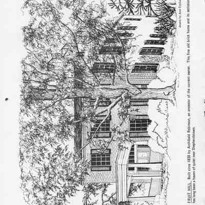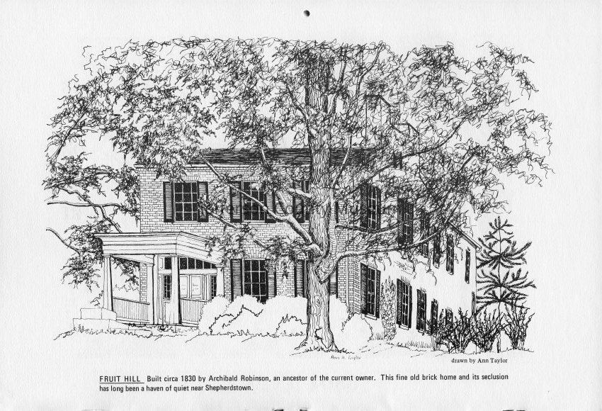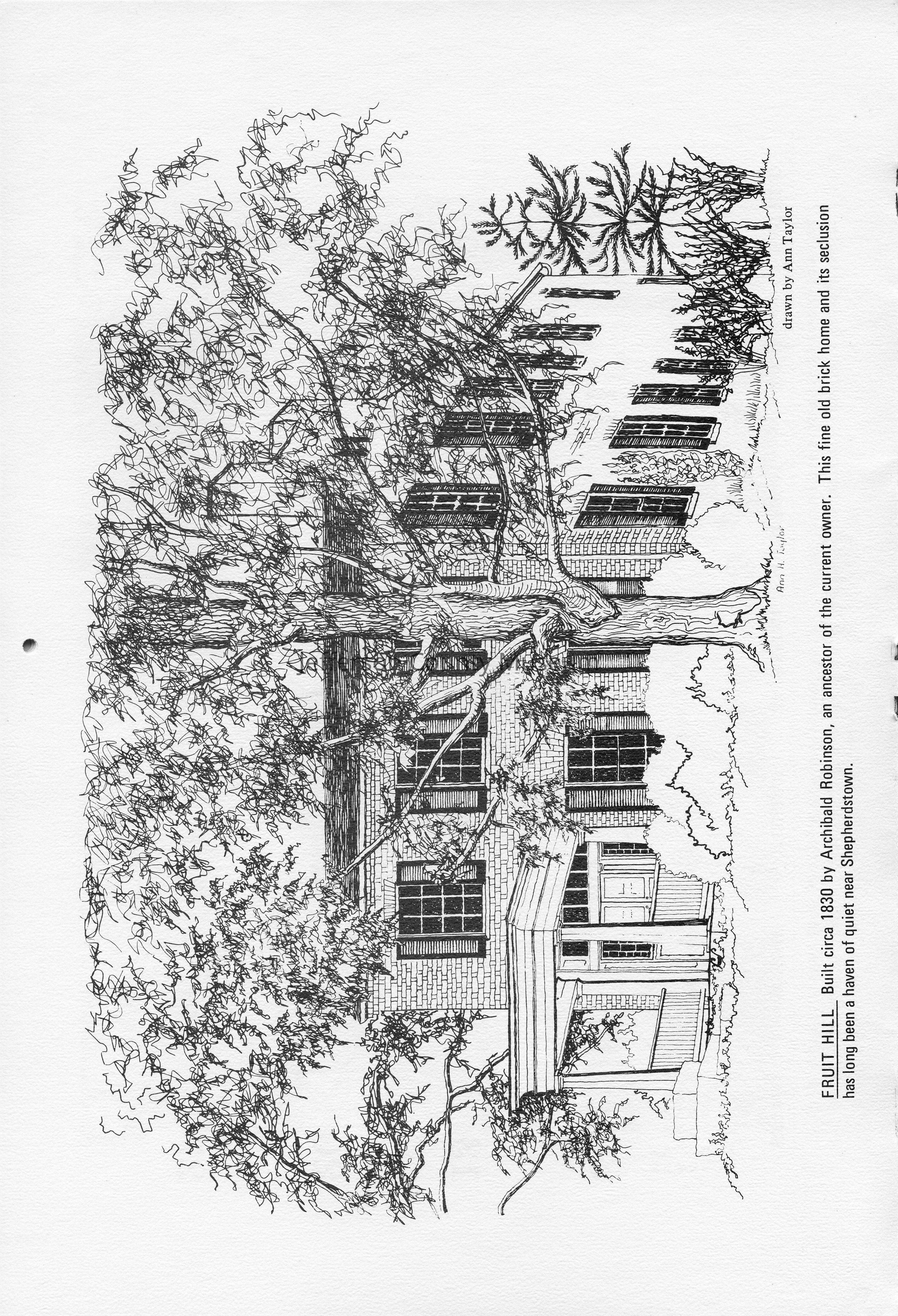Fruit Hill - Built circa 1830 by Archibald Robinson, an ancestor of the current owner. This fine old brick home and its seclusion has long been a haven of quiet near Shepherdstown. Drawn by Ann Taylor.