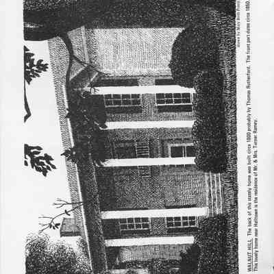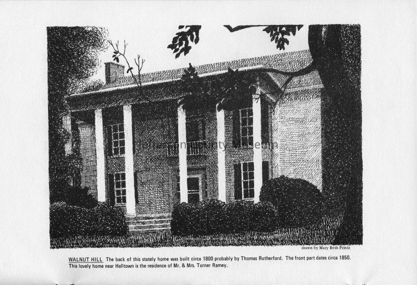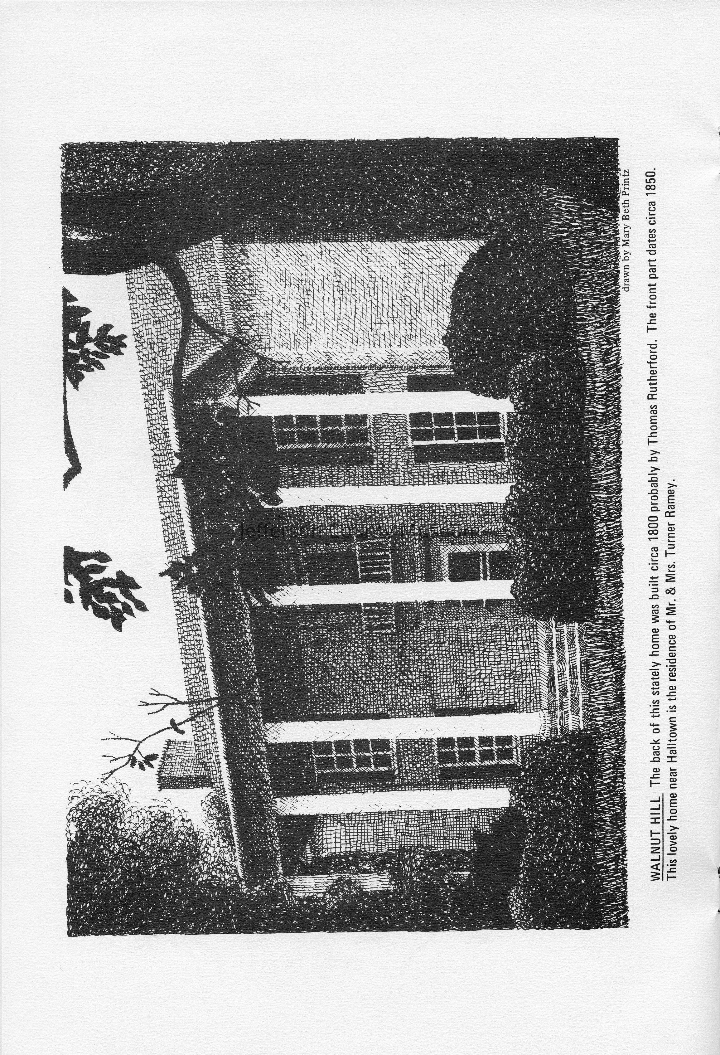 Walnut Hill - The back of this stately home was built circa 1800 probably by Thomas Rutherford. The front part dates circa 1850. This lovely home near Halltown is the residence of Mr. and Mrs. Turner Ramey. Drawn by Mary Beth Printz.