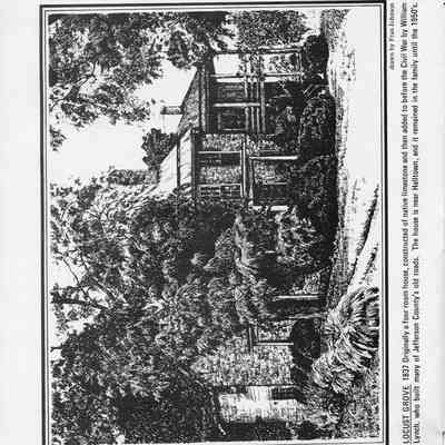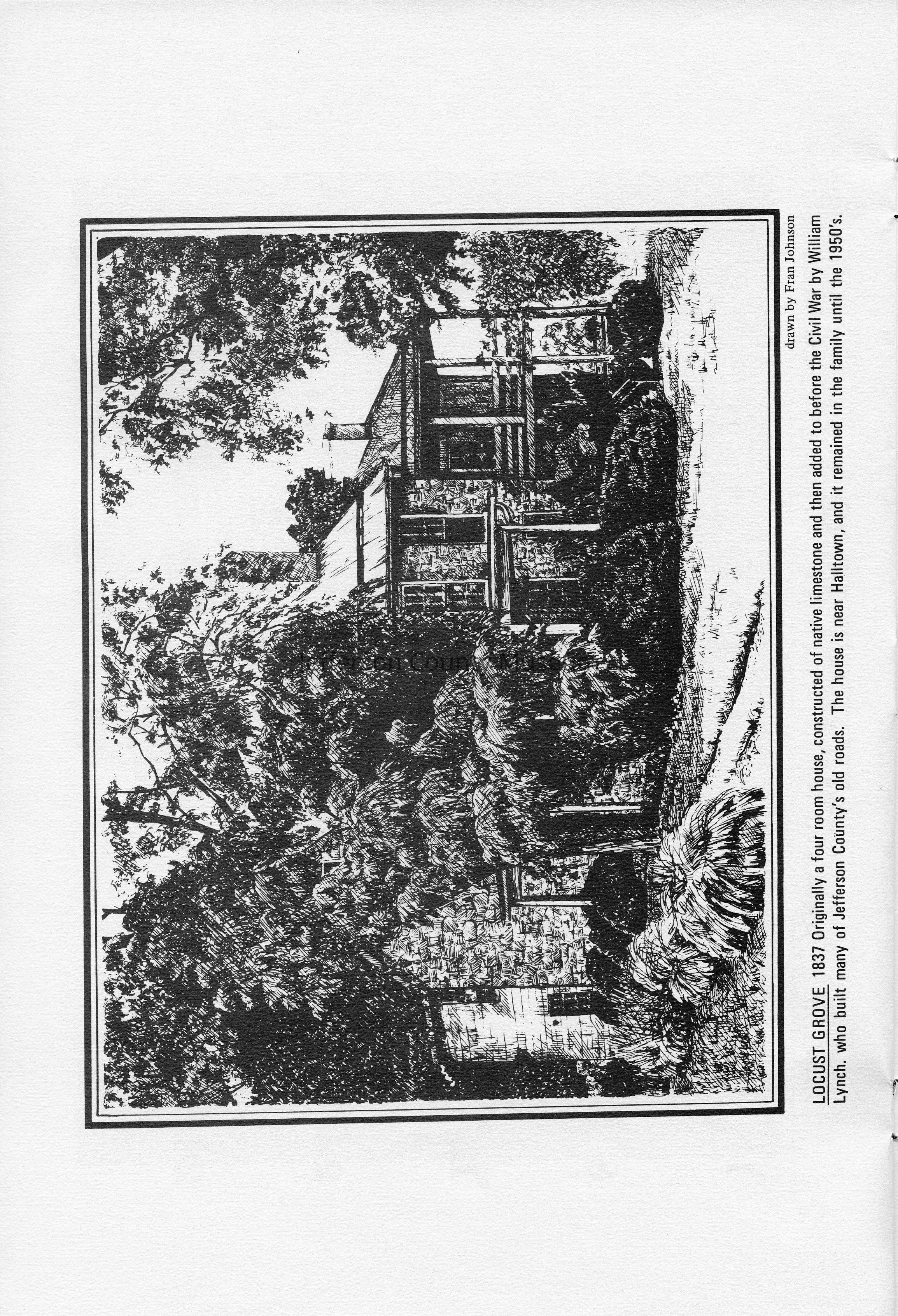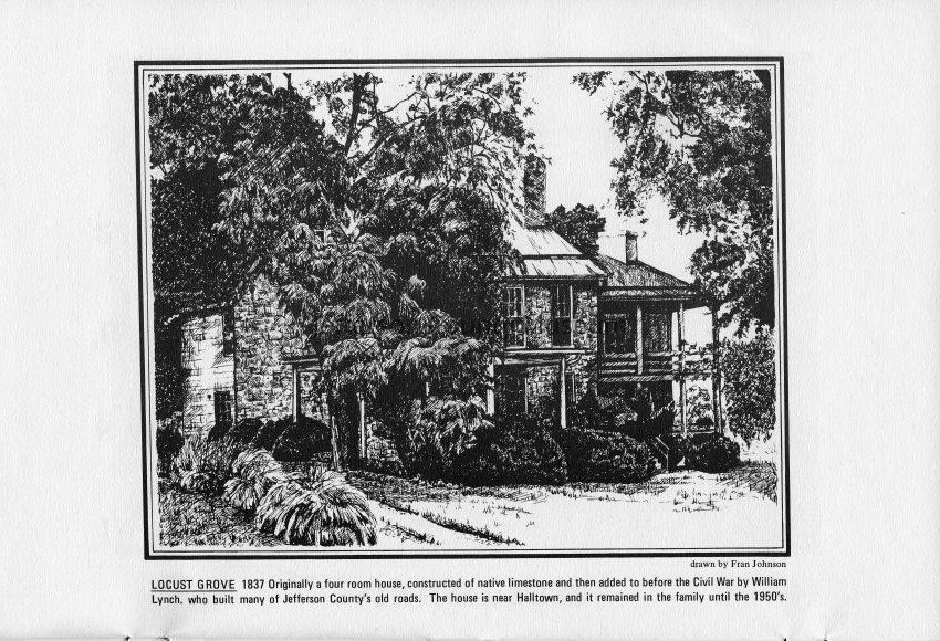 Locust Grove 1837 - Originally a four room house, constructed of native limestone and then added to before the Civil War by William Lynch, who built many of Jefferson County's old roads. The house is near Halltown, and it remained in the family until the 1950's. Drawn by Fran Johnson.
