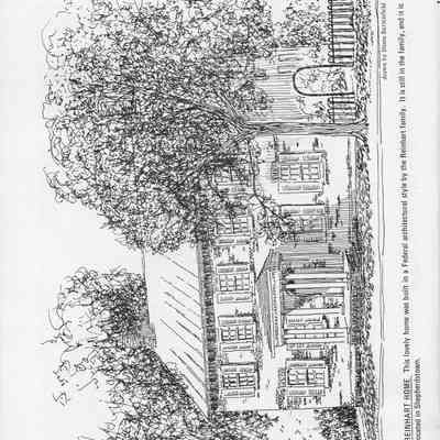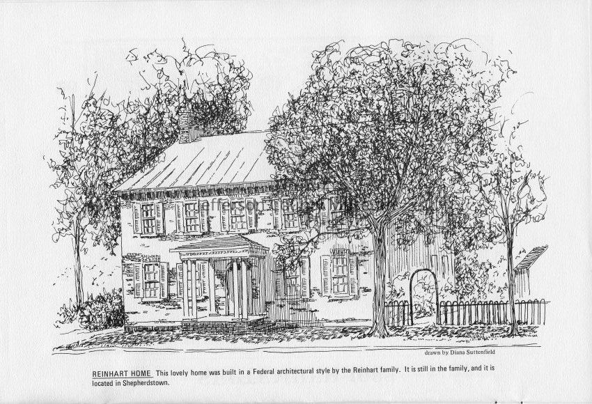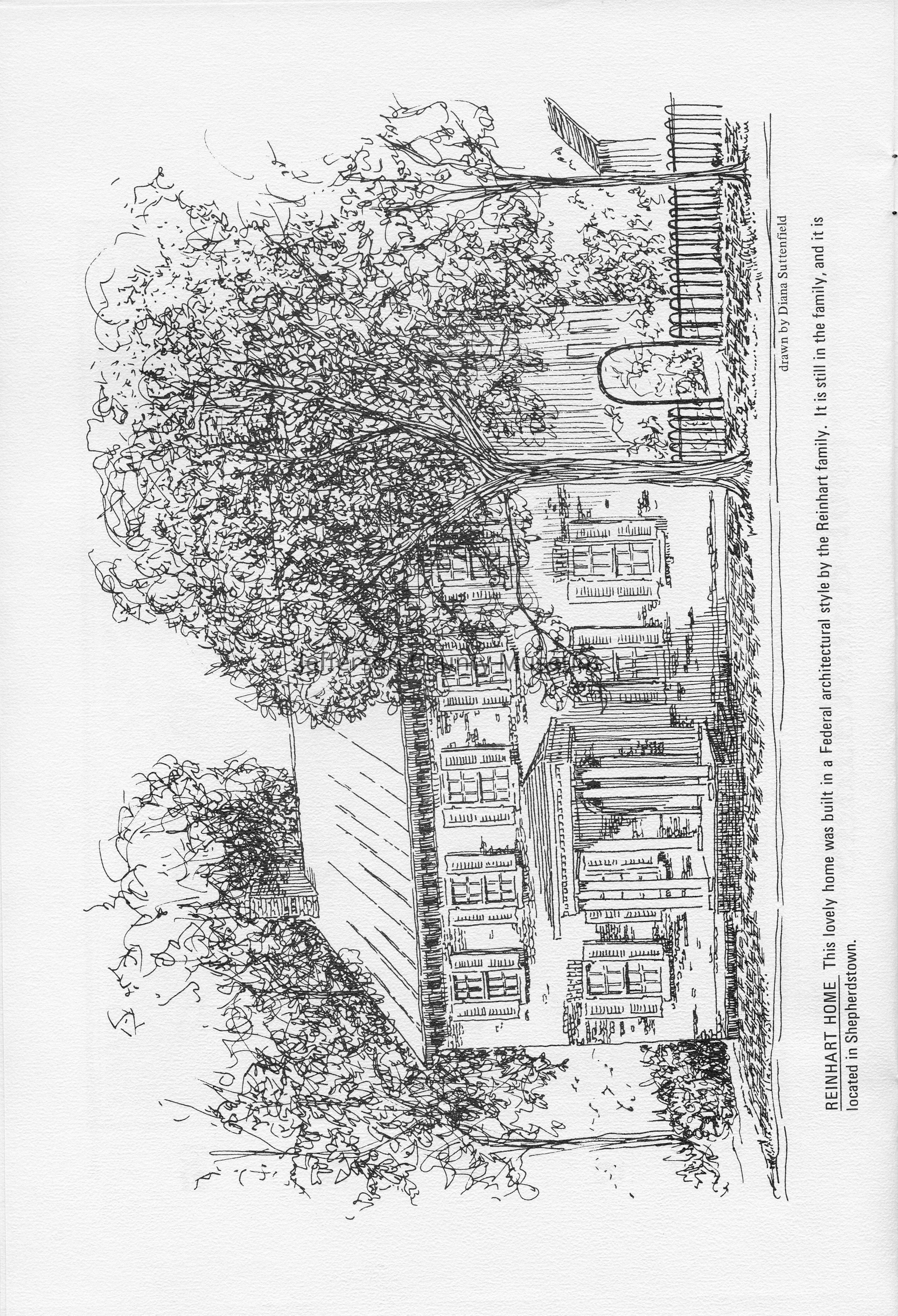 Reinhart Home - This lovely home was built in a Federal architectural style by the Reinhart family. It is still in the family, and it is located in Shepherdstown. Drawn by Diana Suttenfield.