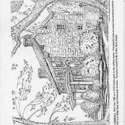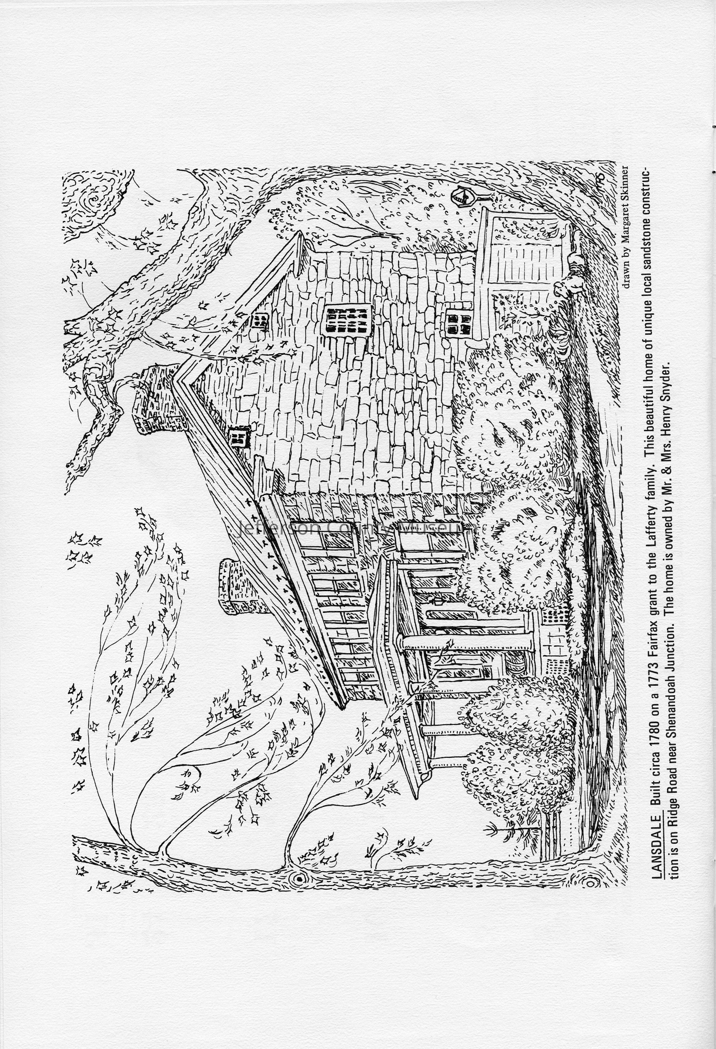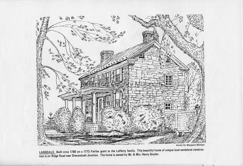Lansdale - Built circa 1780 on a 1773 Fairfax grant to the Lafferty family. This beautiful home of unique local sandstone construction is on Ridge Road near Shenandoah Junction. The home is owned by Mr. and Mrs. Henry Snyder. Drawn by Margaret Skinner.