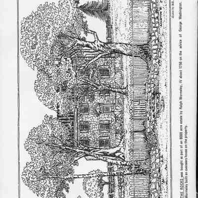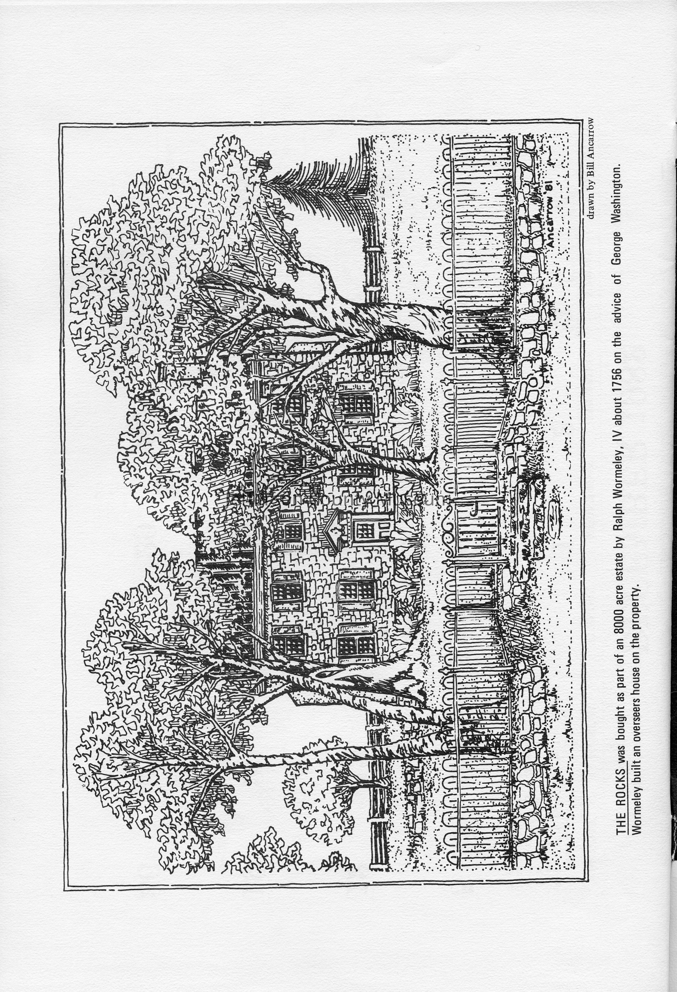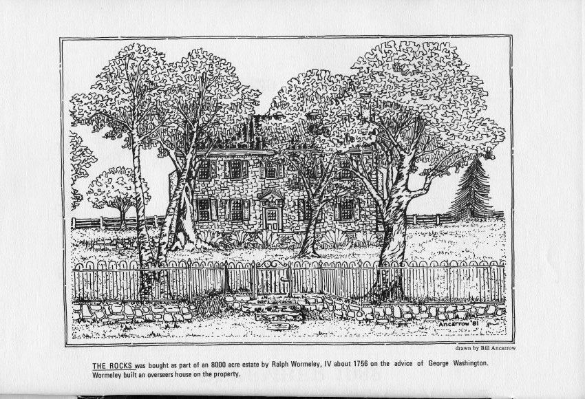 The Rocks was bought as part of an 8,000 acre estate by Ralph Wormeley, IV about 1756 on the advice of George Washington. Wormeley built an overseer's house on the property. Drawn by Bill Ancarrow.Acquisition