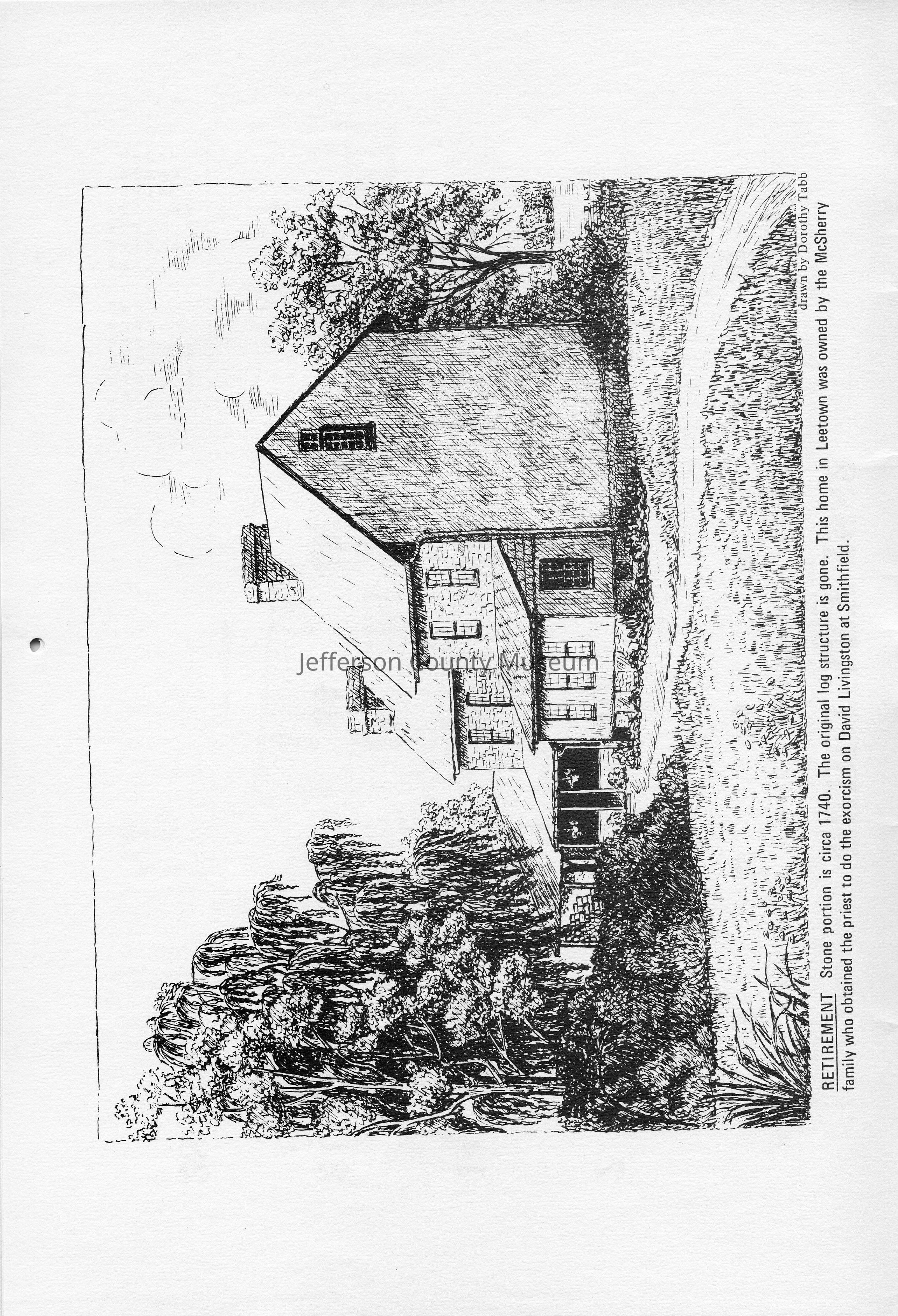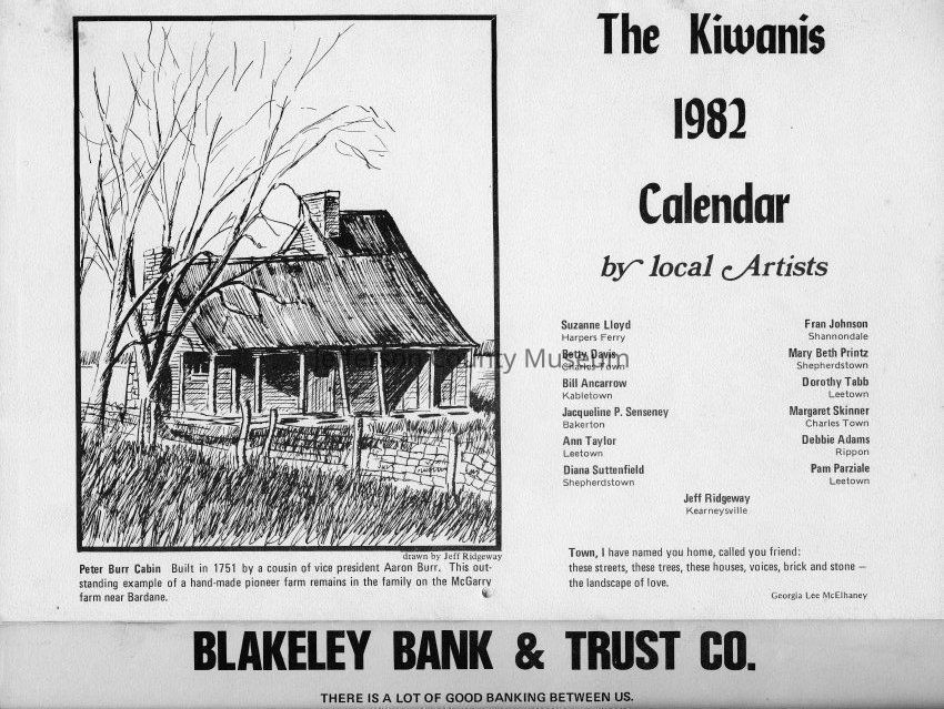 Peter Burr Cabin - Built in 1751 by a cousin of vice president Aaron Burr. This outstanding example of a hand-made pioneer farm remains in the family on the McGarry farm near Bardane. Drawn by Jeff Ridgeway.