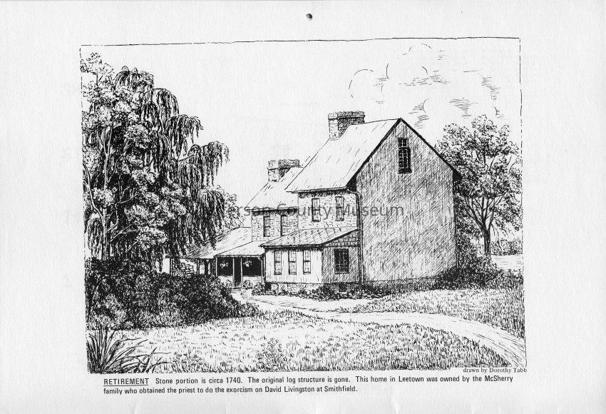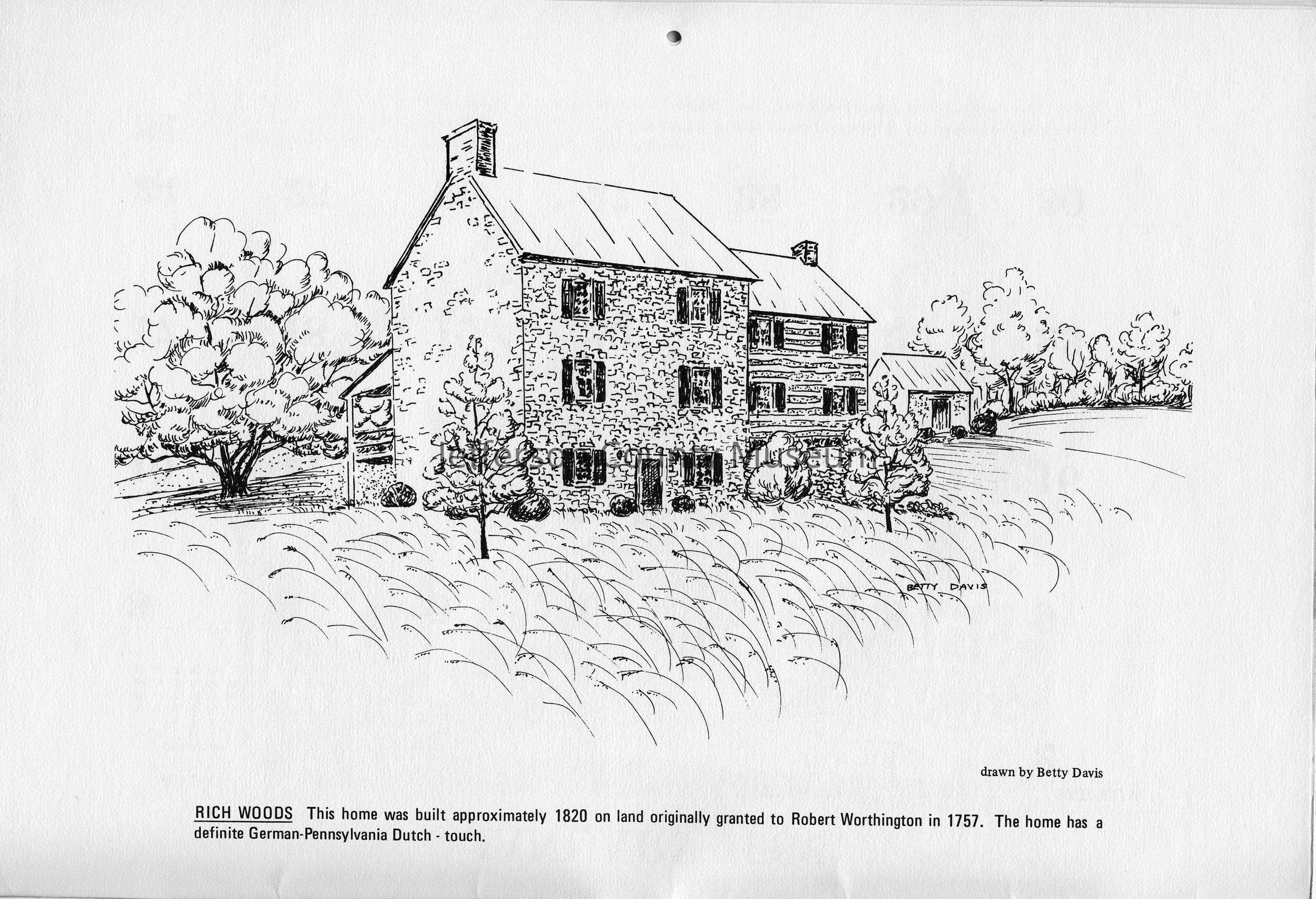 Rich Woods - This home was built approximately 1820 on land originally granted to Robert Worthington in 1757. The home has a definite German-Pennsylvania Dutch - touch. Drawn by Betty Davis.