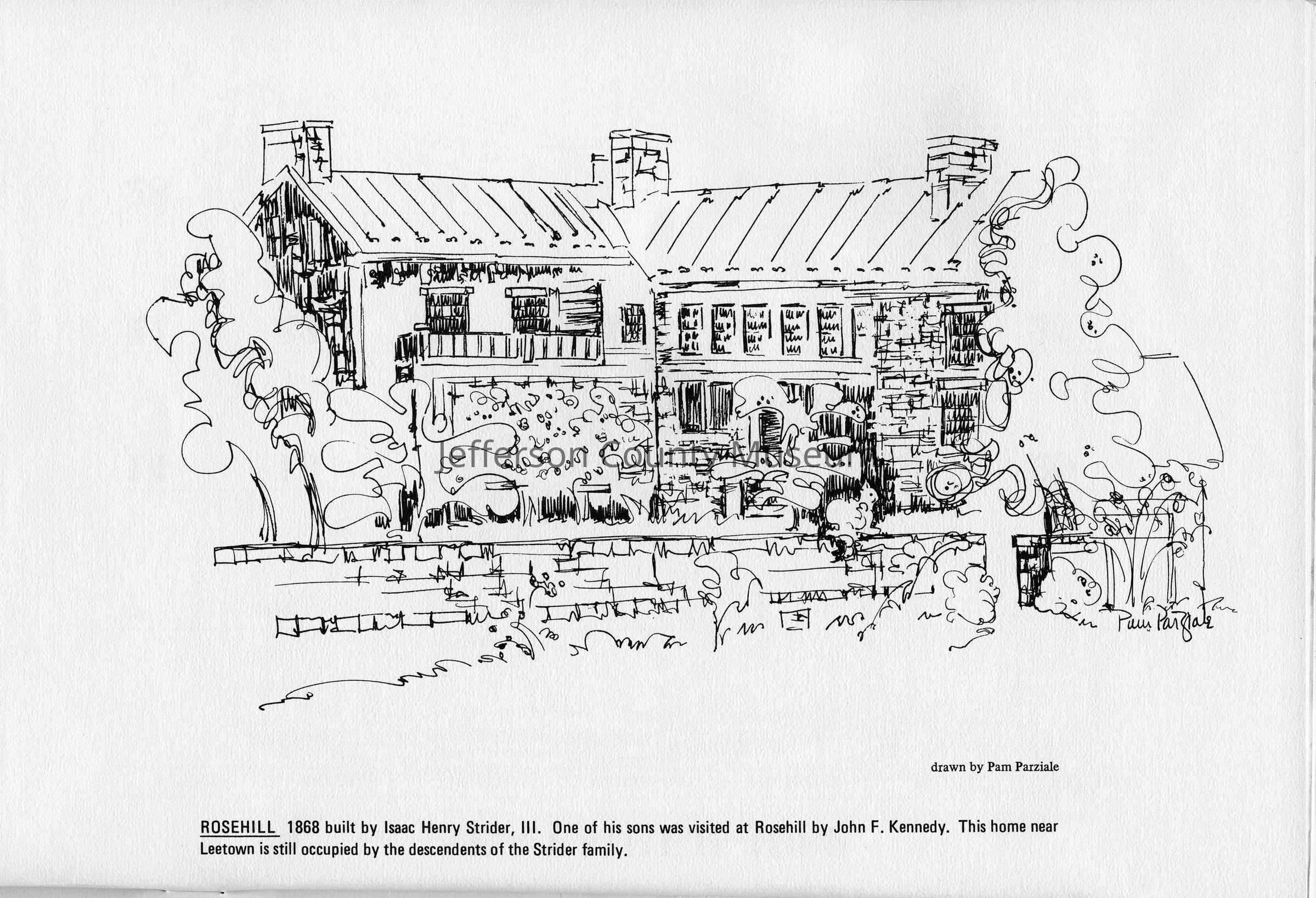 Rosehill 1868 built by Isaac Henry Strider, III. One of his sons was visited at Rosehill by John F. Kennedy. This home near Leetown is still occupied by the descendents of the Strider family. Drawn by Pam Parziale.