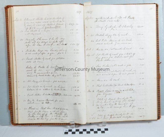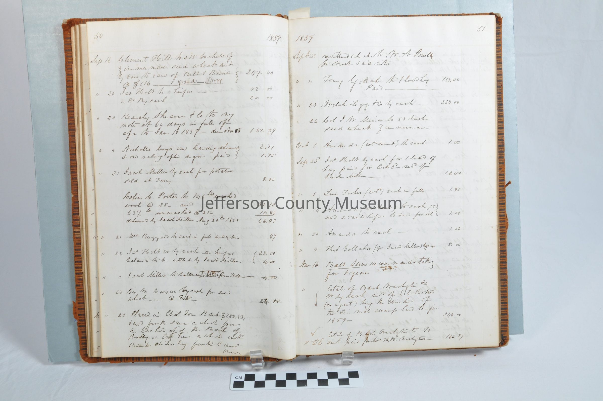 Leather bound journal of Colonel Lewis Washington. "DAY-BOOK" on spine. Diagram hand drawn in front of book for planting trees. Signature "L. W. Washington Oct 1st, 1855" on first page. Journal kept track of all transactions up to April 14, 1870.Acquisition