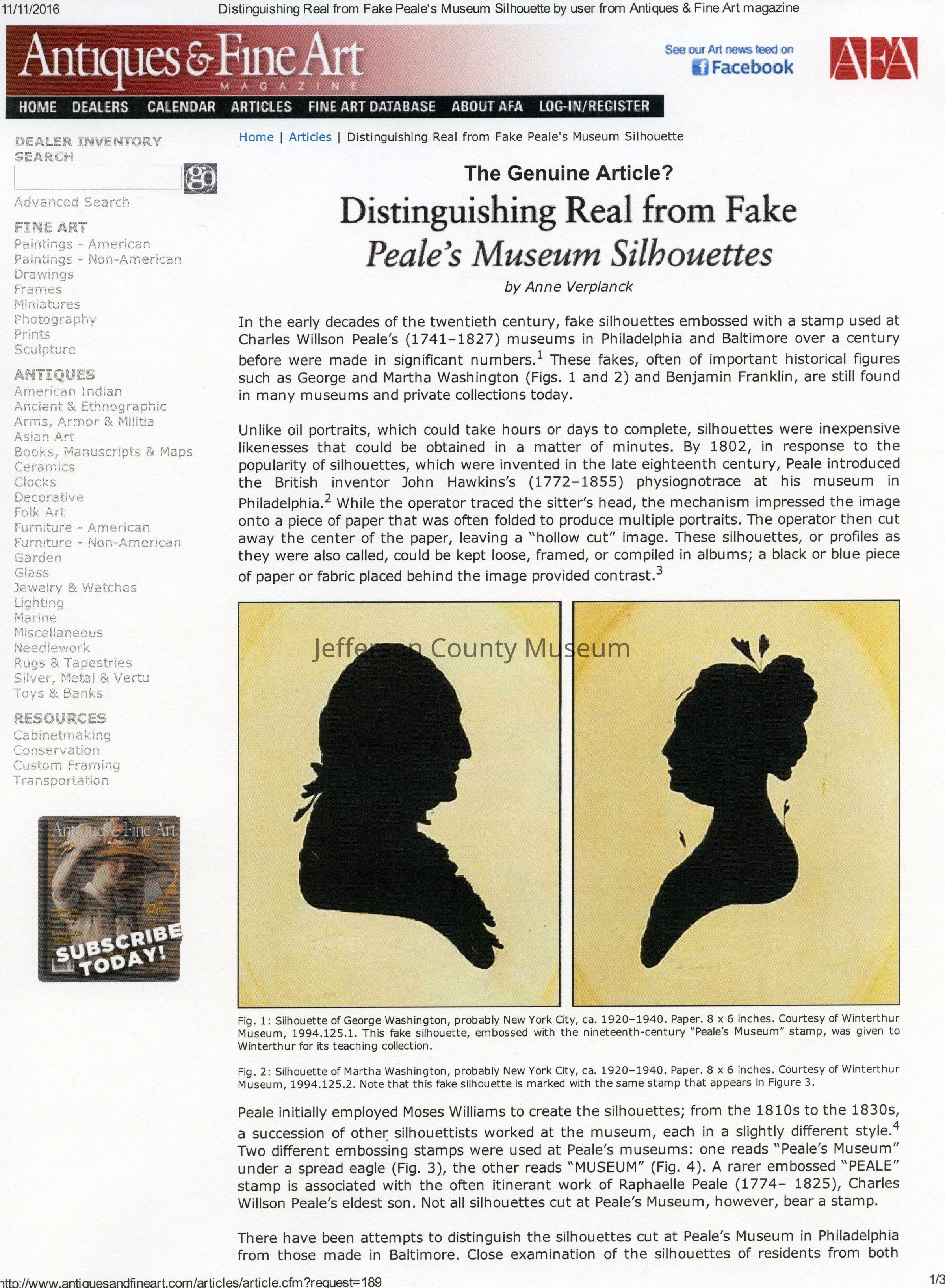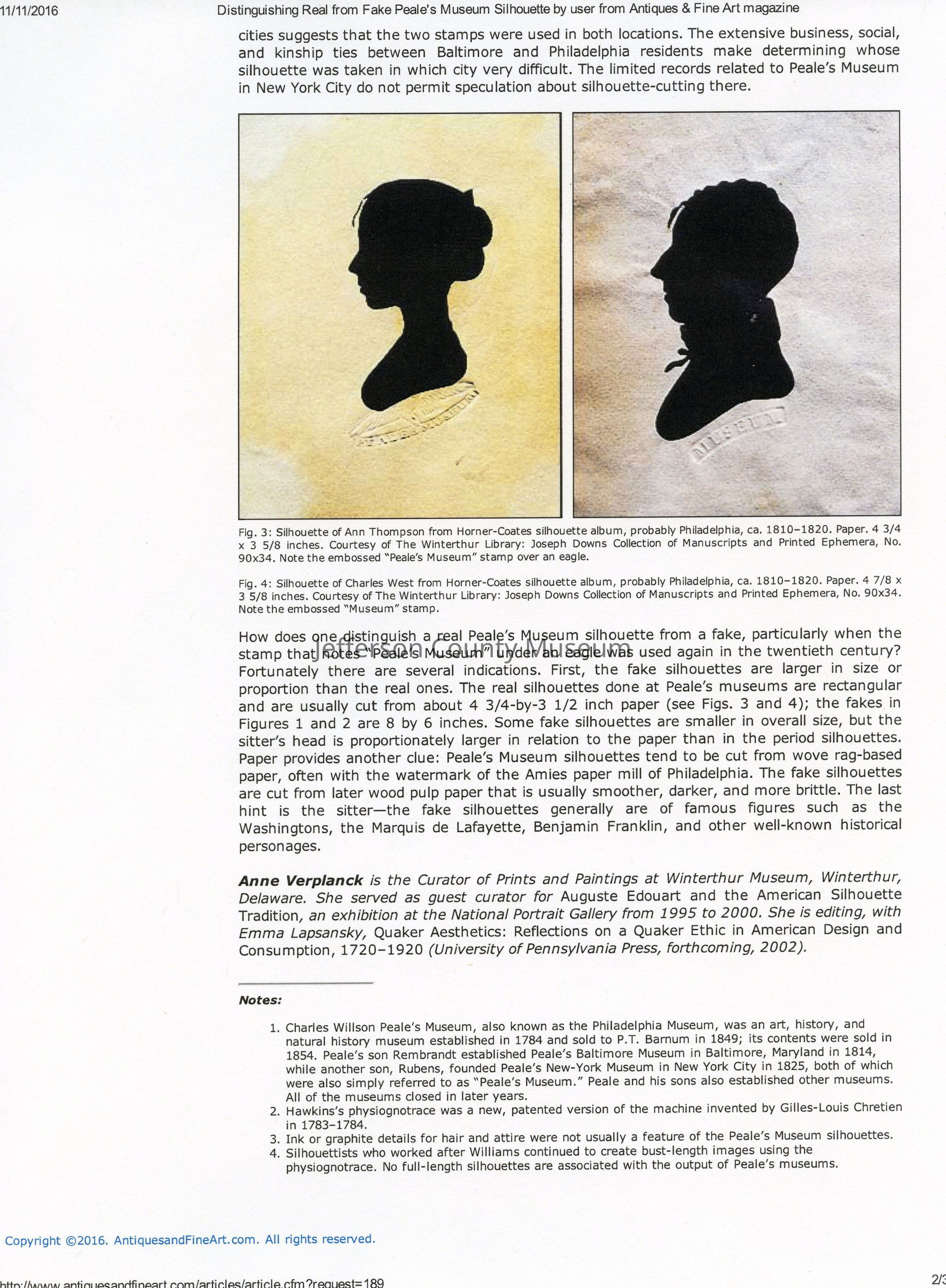 (2) A silhouette of a woman with a scrap of black fabric. Handwritten on the back of the silhouette is "Elizabeth Stackhouse Elizabeth City, New Jersey 1819". According to "Distinguishing Real from Fake Peale's Museum Silhouettes" by Anne Verplanck, in Antiques and Fine Arts Magazine (see Media file), this may be an original Charles Willson Peale Museum silhouette. The silhouette originally was in Susan Compton's book.