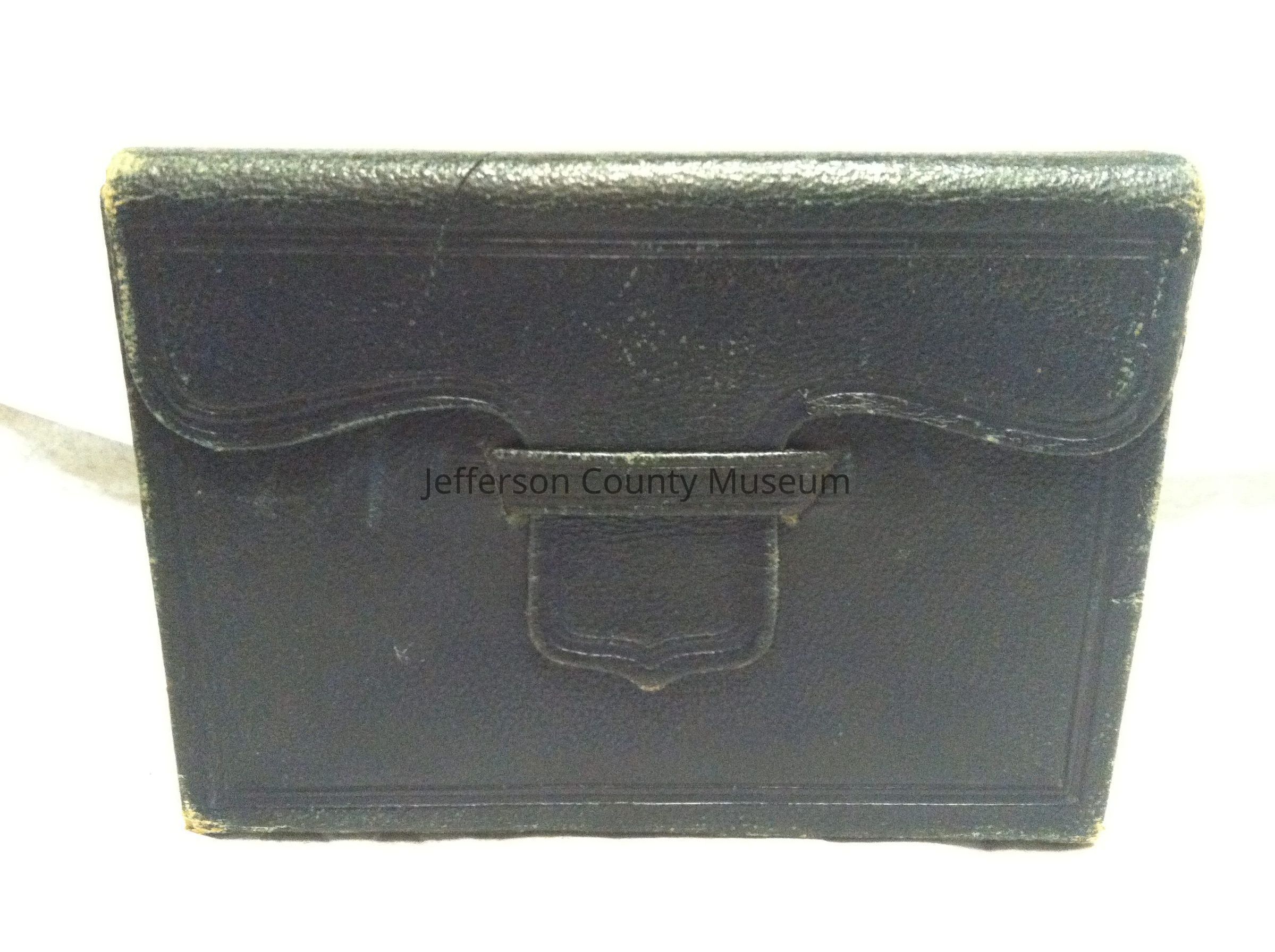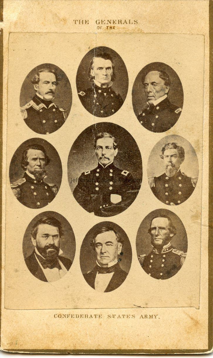 Blue leather-bound photo album. Contains 12 photographs or cartes-de-visite. Includes Jefferson Davis, R. E. Lee, James Longstreet, J.E.B. Stuart and others. Each is in a heavy cardboard page surrounded by gold lines. On back of one is long handwritten note in pencil describing actions in the Civil War. On front page in gold surrounded by fancy gold border: PHOTOGRAPH Album. PHILADELPHIA: MILLER & BURLOCK. On second page in gold letters: INDEX" with lines down sheet. Several cards have publisher information on the back.