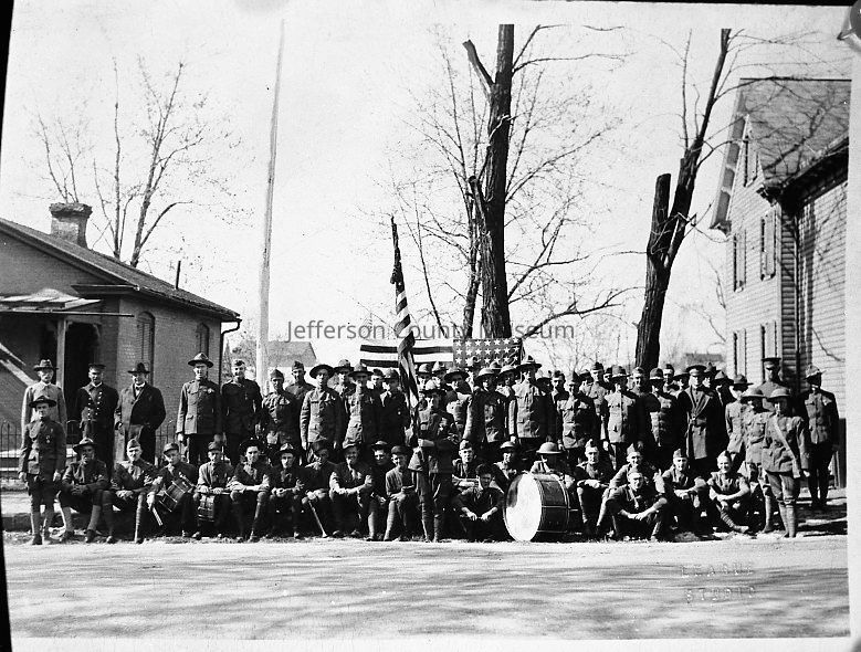 World War I soldiers at a position on East Washington Street near the Library and Civic Center. The building on the left was the office Dr. James M. Ranson, Jr. This group was the original American Legion members of Jackson Perks Post. The dentist's office became, with several additions, the building known as the Old Charles Town Library.
